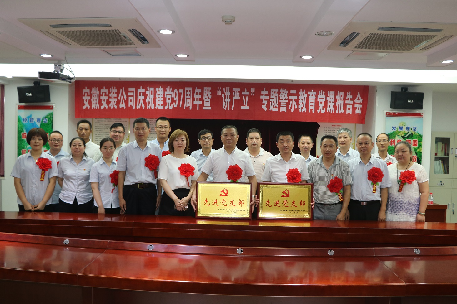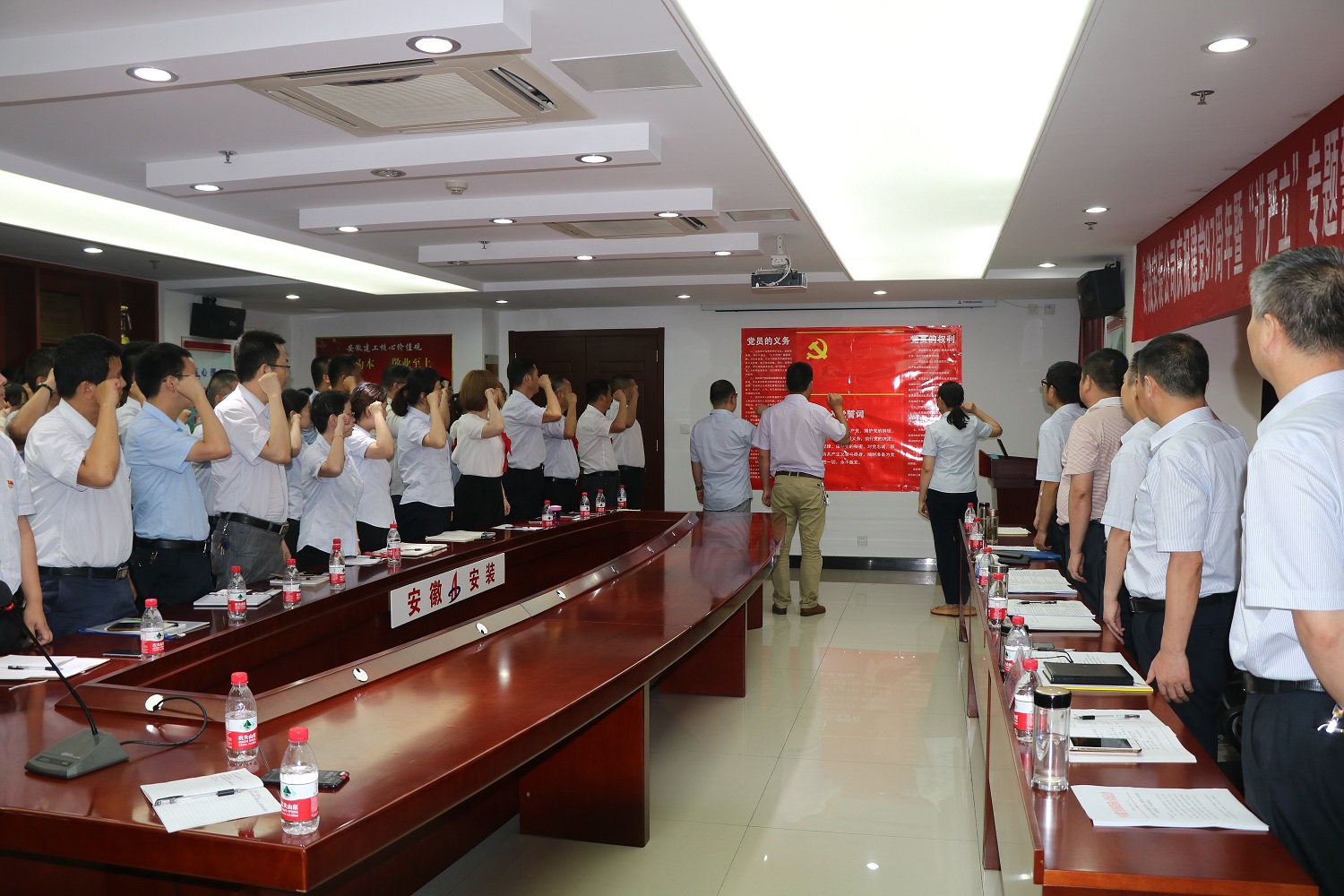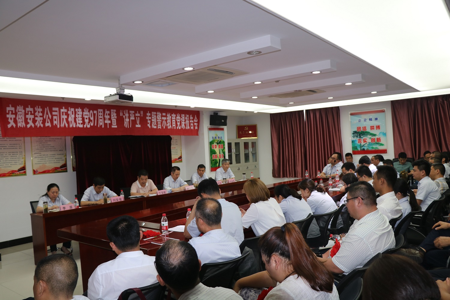 為慶祝中國共產(chǎn)黨建黨97周年,扎實(shí)開展好“講忠誠、嚴(yán)紀(jì)律、立政德”專題警示教育,推動(dòng)全面從嚴(yán)治黨向縱深發(fā)展。7月4日下午,安徽安裝公司黨委召開慶祝建黨97周年暨“講嚴(yán)立”專題警示教育黨課報(bào)告會(huì)。公司黨委書記、副總經(jīng)理胡六中作了題為《講忠誠 嚴(yán)紀(jì)律 立政德 做新時(shí)代合格共產(chǎn)黨員》的黨課報(bào)告。公司董事長、總經(jīng)理、黨委副書記王軍邦主持會(huì)議并宣貫集團(tuán)公司慶祝建黨97周年暨黨的建設(shè)工作會(huì)議精神。黨委委員、副總經(jīng)理劉安俊宣讀表彰決定。公司領(lǐng)導(dǎo)班子成員、機(jī)關(guān)部門正副職、機(jī)關(guān)在崗黨員、分公司領(lǐng)導(dǎo)班子成員和受表彰的先進(jìn)基層黨組織、優(yōu)秀共產(chǎn)黨員和優(yōu)秀黨務(wù)工作者共70余人參加會(huì)議。