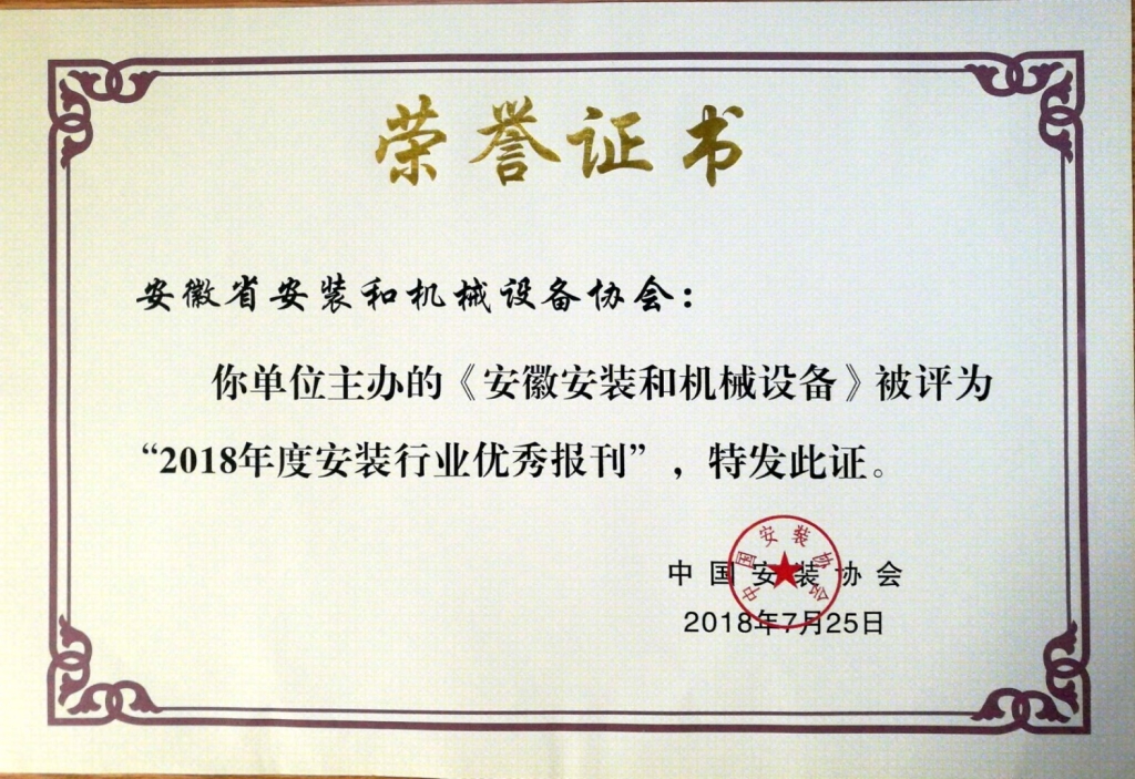 安徽省安裝和機(jī)械設(shè)備協(xié)會榮獲2018年度“安裝行業(yè)優(yōu)秀報(bào)刊”和“安裝行業(yè)優(yōu)秀網(wǎng)站”稱號