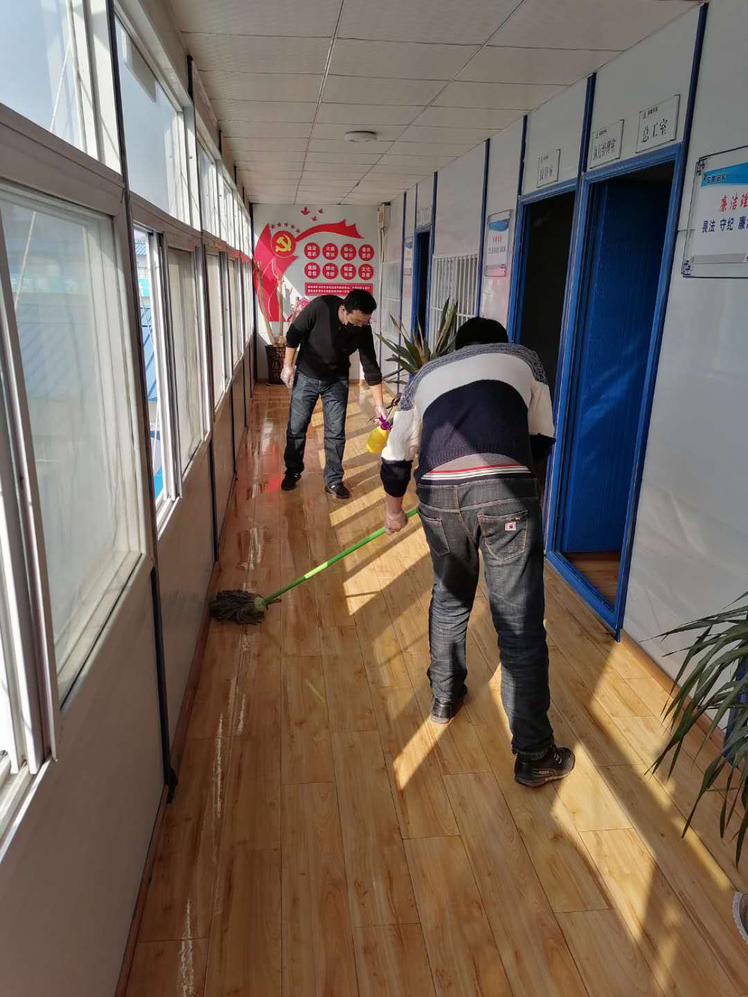 切實(shí)做好后勤保障工作。項(xiàng)目部對(duì)員工及工人的食宿進(jìn)行統(tǒng)一管理。項(xiàng)目食堂由專(zhuān)人進(jìn)行食物采買(mǎi),確保食材的質(zhì)和量,每日記錄就餐情況統(tǒng)計(jì)表保證所有人員一日三餐安全健康。施工現(xiàn)場(chǎng)、辦公區(qū)域及宿舍每日安排專(zhuān)人定時(shí)消毒。宿舍設(shè)立住宿人員值班表,每天打掃衛(wèi)生保持房間清潔。