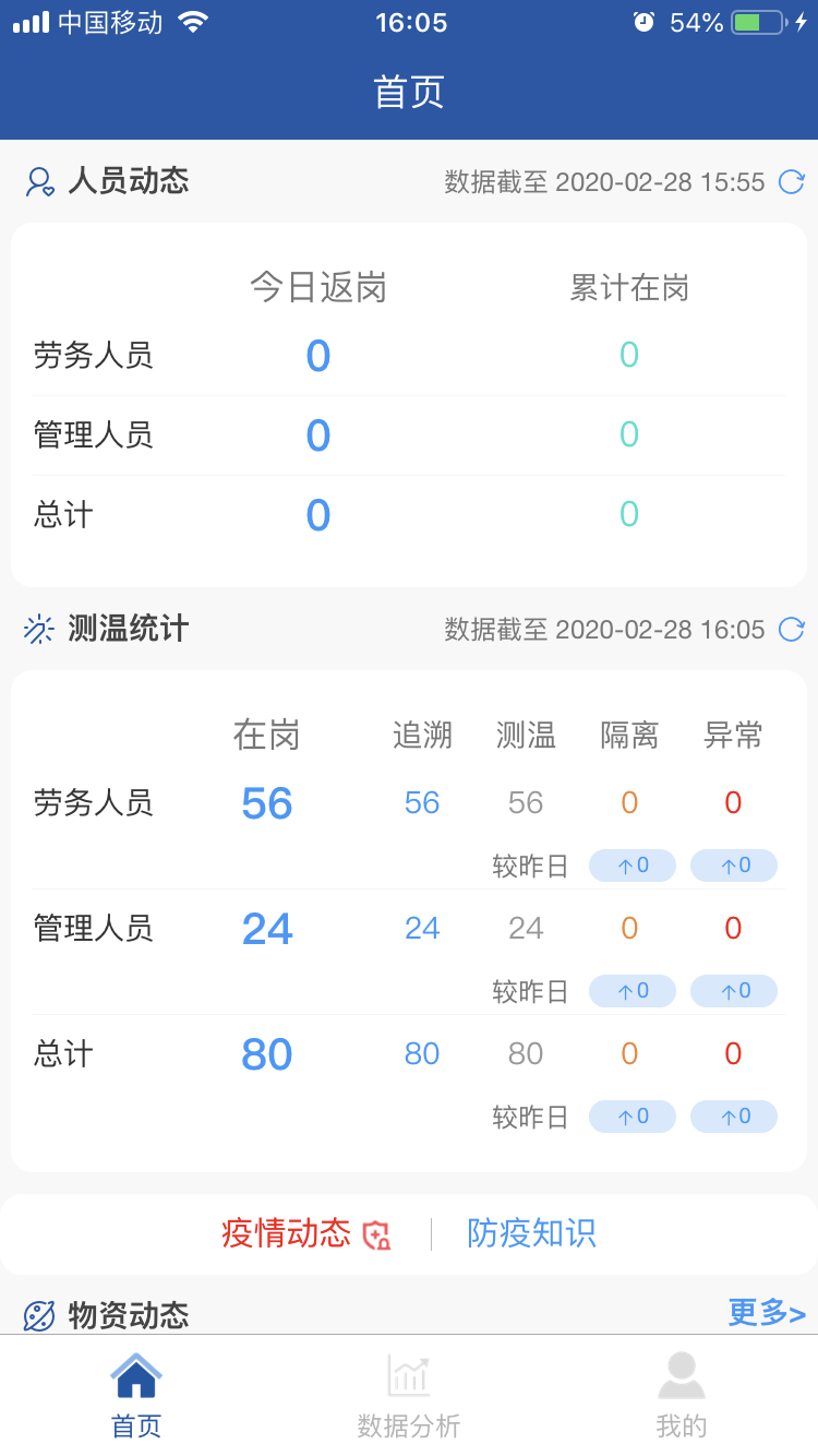 項目全面推行“返崗復工疫情防控系統(tǒng)”APP。主頁面包括勞務(wù)人員追溯、勞務(wù)人員測溫、防控物資采購、消毒記錄、疫情培訓等11個專題版面,通過這些功能可線上及時填報人員返崗日期、體溫、癥狀及是否為留守人員等詳細信息,還有項目部的疫情物資采購情況、環(huán)境衛(wèi)生的消殺情況等相關(guān)信息,使上線人員時時了解疫情防控動態(tài),充分借助信息技術(shù)手段,全力打贏疫情防控“戰(zhàn)役”。 借助這一平臺確保項目部實時、準確、有效地掌握現(xiàn)場人員的健康情況,助力疫情防控工作。
