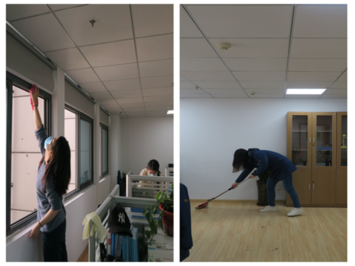 風和日麗,大家早早的來到辦公室,三五一組,相互配合,擼起袖子加油干。開窗通風、地面清掃、消毒殺菌、門窗擦拭、書柜整理、綠植澆灌、垃圾傾倒……大家熱情高漲、干勁十足,仔仔細細清理著每個角落,不遺漏任何一個死角。經(jīng)過半個多小時的辛勤勞動,辦公區(qū)域頓時變得更加清新明亮、干凈整潔,不由得令人耳目一新、賞心悅目。隨后,分公司文明衛(wèi)生檢查組還對各部門的衛(wèi)生情況進行了嚴格打分,并對檢查結果進行了通報。