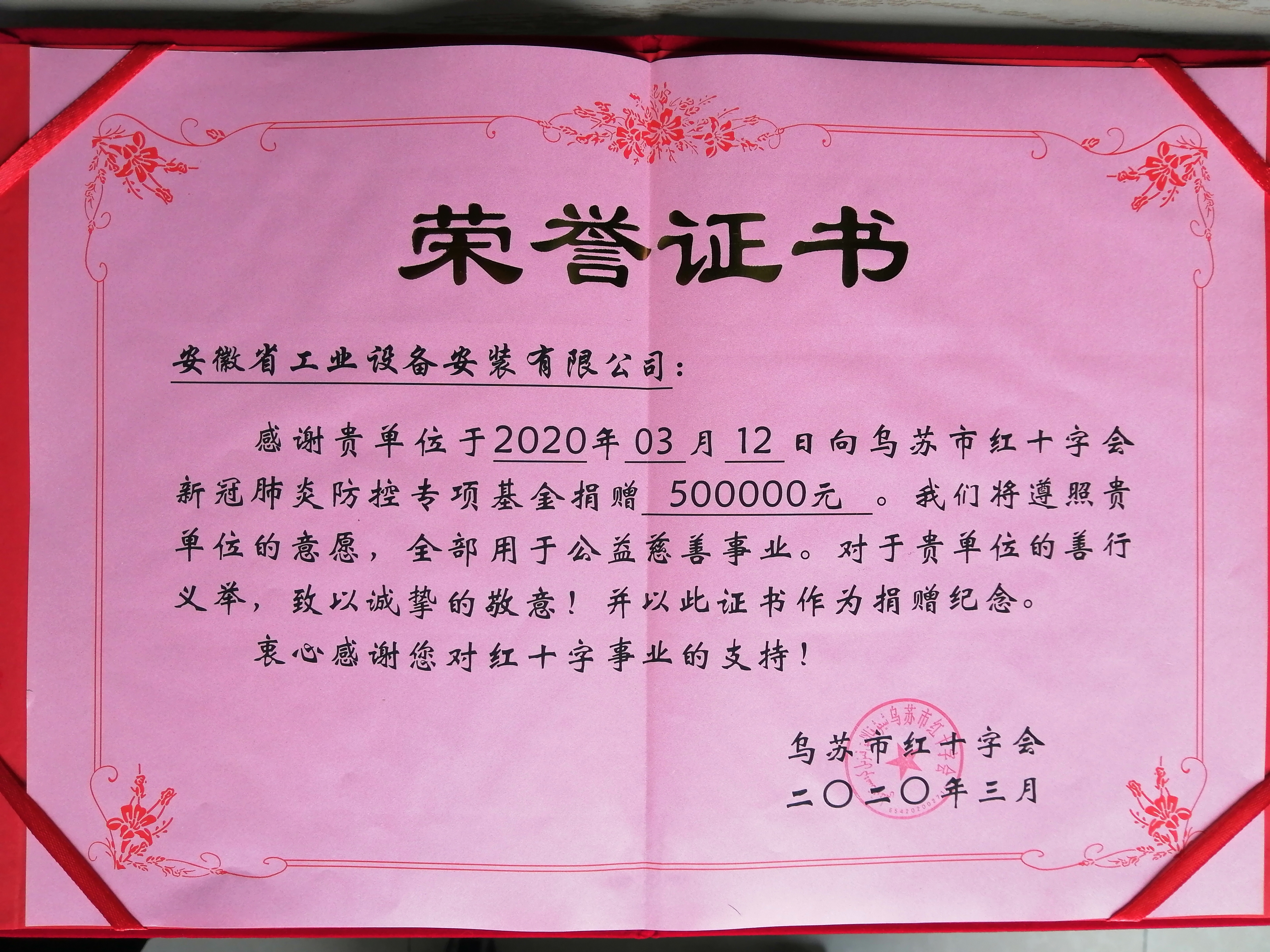 3月12日,安徽安裝公司向新疆烏蘇市紅十字會(huì)捐款50萬(wàn)元,助力打贏疫情防控阻擊戰(zhàn)。