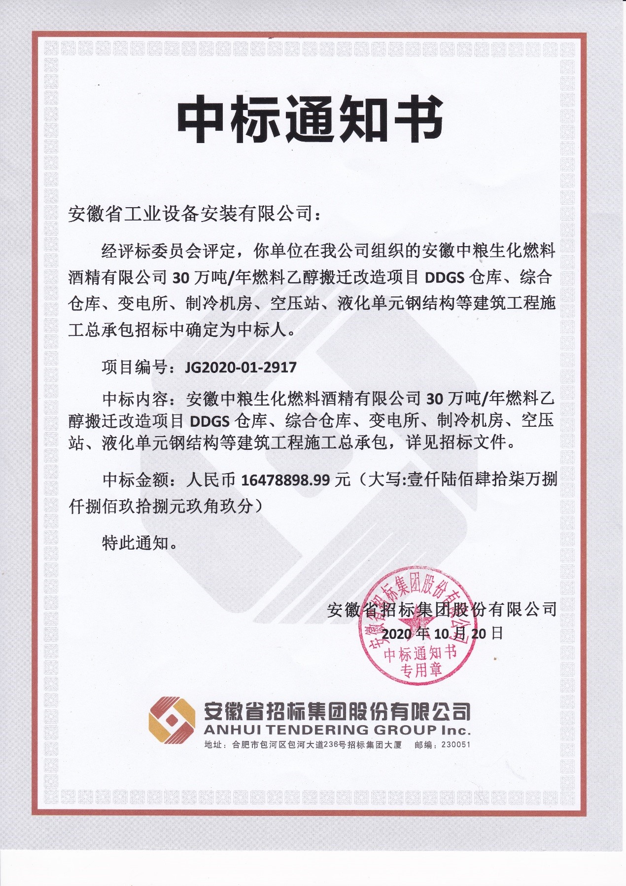 近日,蚌埠分公司經(jīng)過激烈競標(biāo),成功中標(biāo)安徽中糧生化燃料酒精有限公司30萬噸/年燃料乙醇搬遷改造項目DDGS倉庫、綜合倉庫、變電所、制冷機(jī)房、空壓站、液化單元鋼結(jié)構(gòu)等建筑工程施工總承包項目,中標(biāo)金額:1647.89萬元。過硬的資質(zhì)、雄厚的技術(shù)實(shí)力、合理的價格、誠實(shí)守信的經(jīng)營方式、完善的服務(wù)體系是我們勝出的理由。
