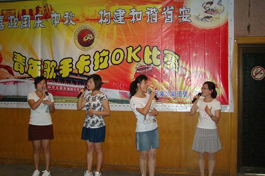 為慶祝新中國成立60周年暨傳統(tǒng)中秋佳節(jié),推動企業(yè)文化建設(shè),9月4日下午,由公司團(tuán)委、工會共同舉辦的以“喜迎國慶·中秋  構(gòu)建和諧省安”為主題的青年歌手卡拉OK大賽在公司職工之家隆重舉行。來自公司機(jī)關(guān)、項(xiàng)目部及各分公司選派的18名選手參加了比賽。集團(tuán)公司機(jī)關(guān)黨委書記宋曉英、工會女工委主任胡愛紅、人力資源部主任胡建英等應(yīng)邀擔(dān)任本次比賽評委。公司領(lǐng)導(dǎo)及廣大職工踴躍到場觀看、鼓勁。
