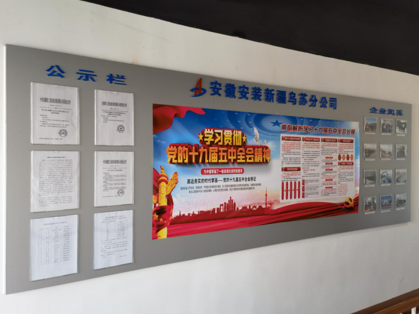 走進安徽安裝公司新疆烏蘇分公司辦公區(qū),一塊紅色的黨建公開欄首先映入眼簾。公開欄還包括黨員風采、公示欄、黨務(wù)公開、光榮榜等板塊,成為分公司一處醒目的景觀。