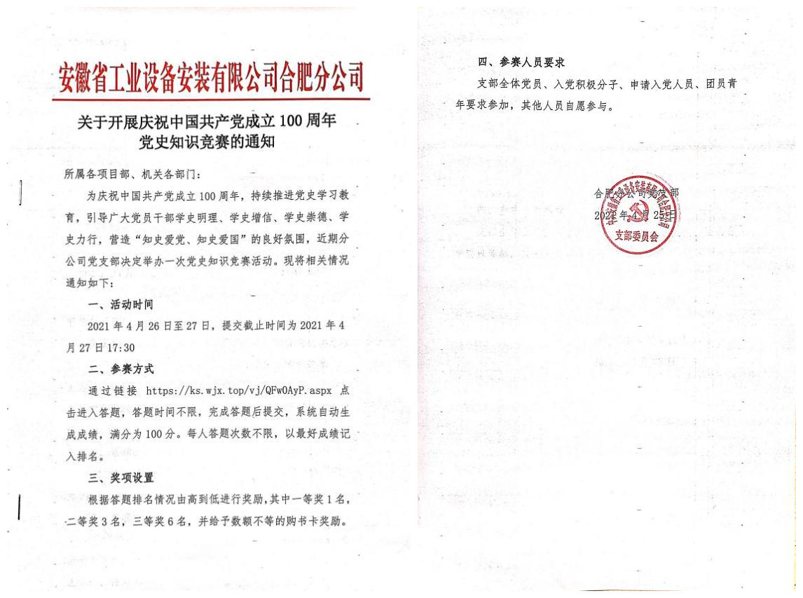 為慶祝中國(guó)共產(chǎn)黨成立100周年,持續(xù)推進(jìn)黨史學(xué)習(xí)教育,引導(dǎo)分公司黨員干部學(xué)史明理、學(xué)史增信、學(xué)史崇德、學(xué)史力行,營(yíng)造“知史愛(ài)黨、知史愛(ài)國(guó)”的良好氛圍,4月26日-27日,合肥分公司黨支部組織開(kāi)展了黨史學(xué)習(xí)教育知識(shí)競(jìng)賽活動(dòng)。