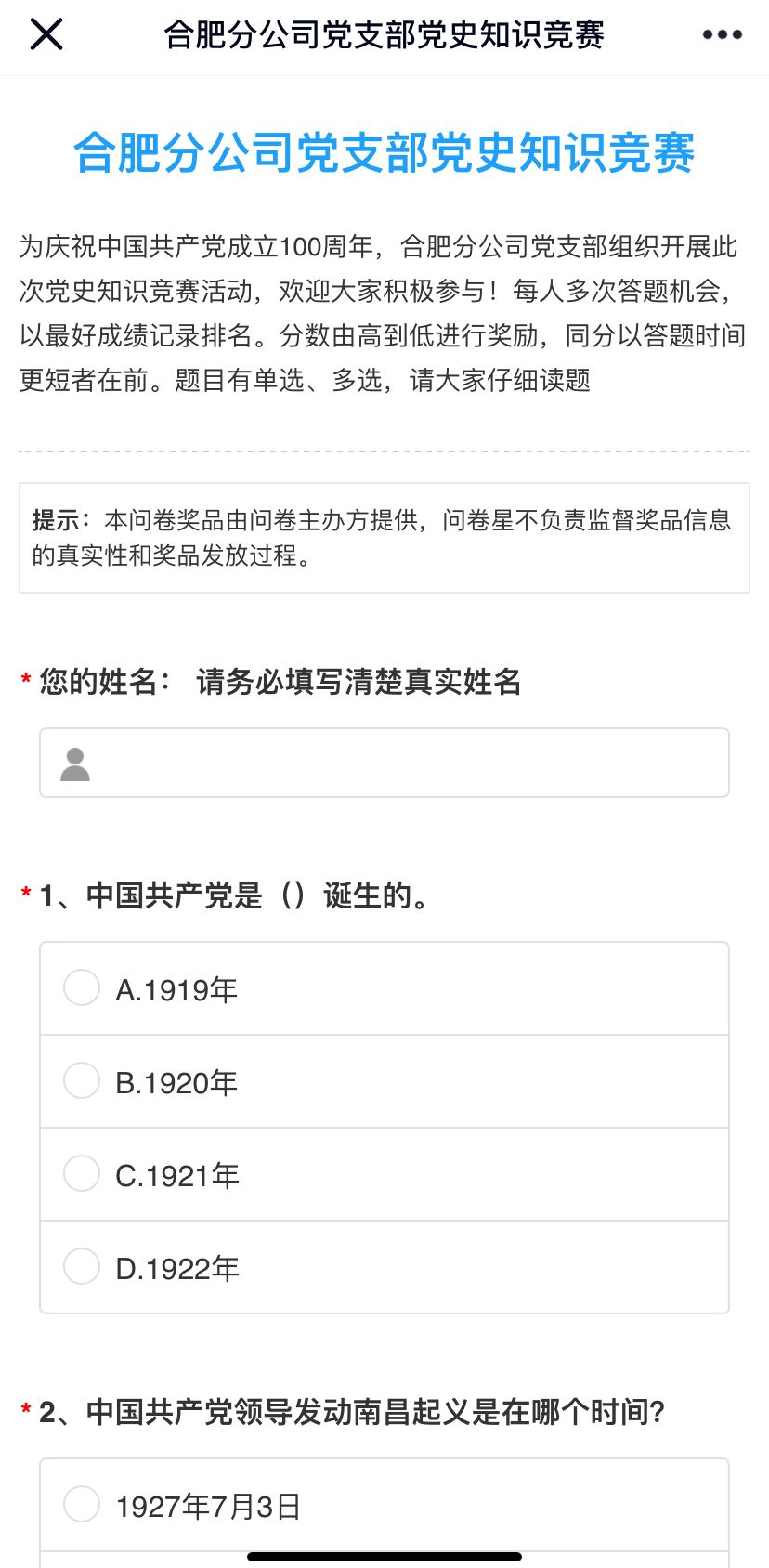 合肥分公司黨支部組織開(kāi)展黨史學(xué)習(xí)教育知識(shí)競(jìng)賽活動(dòng)