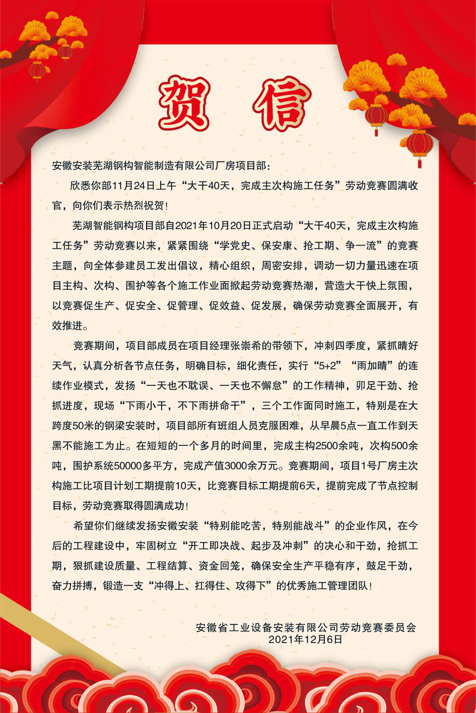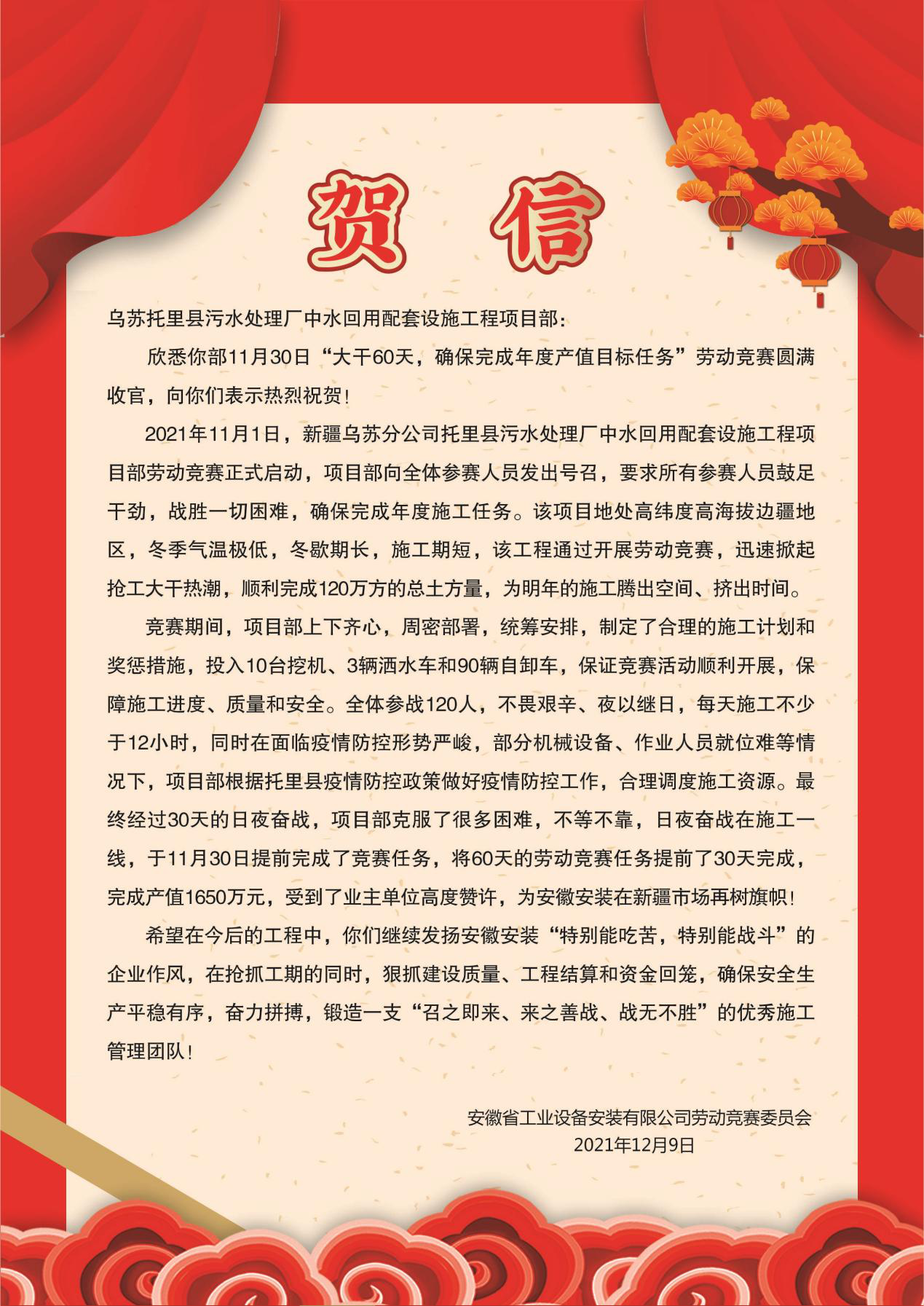 近日,公司勞動(dòng)競(jìng)賽委員會(huì)向蕪湖鋼構(gòu)智能制造有限公司廠房鋼結(jié)構(gòu)項(xiàng)目部和新疆托里縣污水處理廠中水回用配套設(shè)施工程項(xiàng)目部發(fā)出賀信,祝賀兩項(xiàng)目部勞動(dòng)競(jìng)賽圓滿完成!