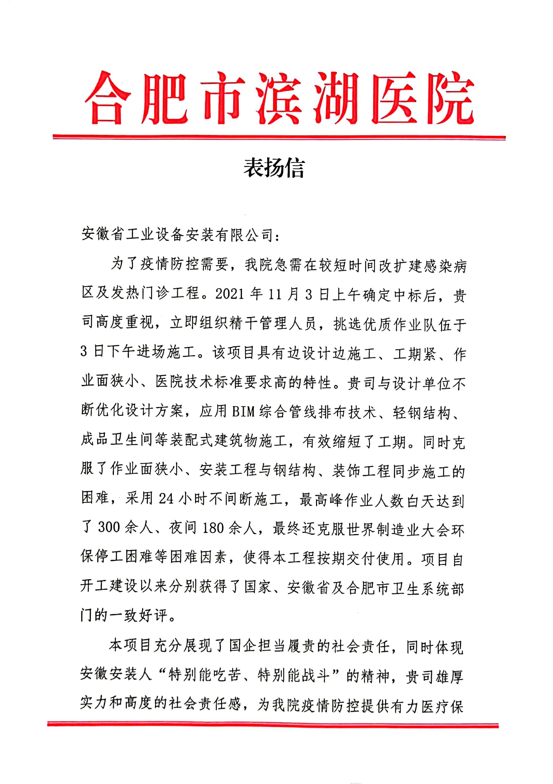 喜報(bào)!安徽安裝公司收到合肥市濱湖醫(yī)院 表?yè)P(yáng)信
