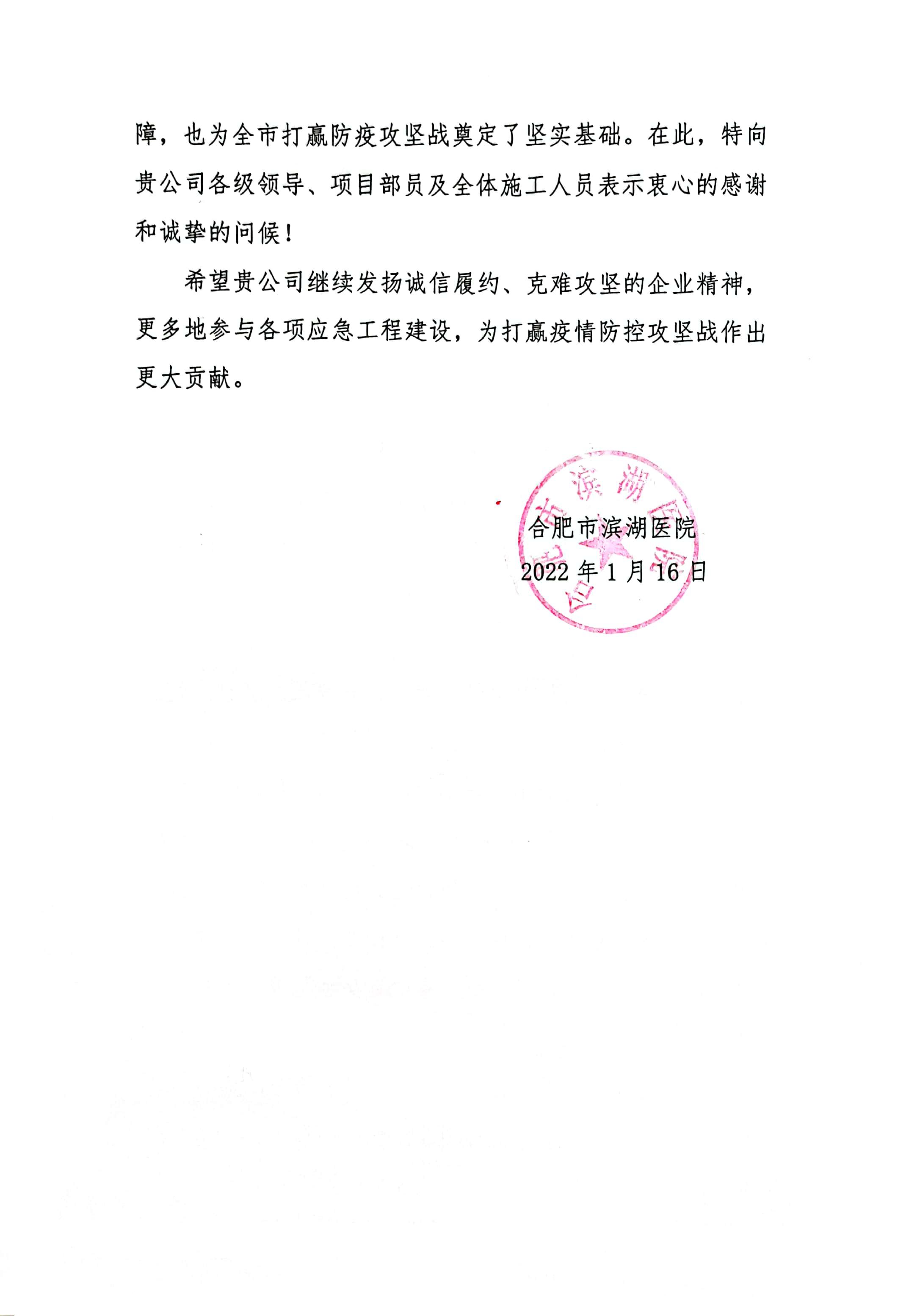 近日,安徽安裝公司收到合肥市濱湖醫(yī)院表?yè)P(yáng)信,信中高度贊揚(yáng)公司濱湖醫(yī)院感染病區(qū)及發(fā)熱門(mén)診應(yīng)急改造工程設(shè)計(jì)施工一體化方艙醫(yī)院項(xiàng)目克服重重困難,縮短工期,一個(gè)月的時(shí)間內(nèi)按期交付使用。該項(xiàng)目充分展現(xiàn)了安徽安裝作為國(guó)有企業(yè)擔(dān)當(dāng)履責(zé)的社會(huì)責(zé)任,為合肥市打贏(yíng)防疫攻堅(jiān)戰(zhàn)奠定了堅(jiān)實(shí)基礎(chǔ)。