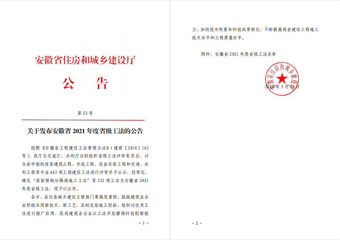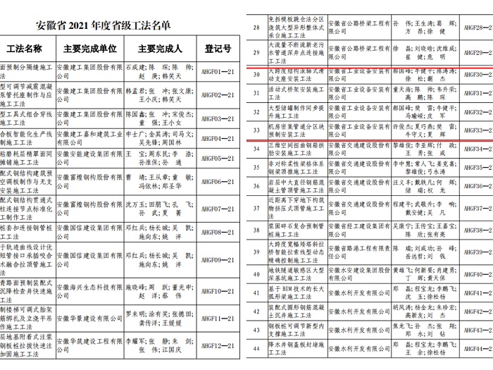 近日,安徽省住房和城鄉(xiāng)建設廳第22號公告公布2021年度安徽省省級工法名單,安徽省工業(yè)設備安裝有限公司的《大跨度結(jié)構(gòu)滾軸式滑動支座安裝工法》、《活動式橋架安裝施工工法》、《大型儲罐制作同步提升施工工法》和《機房密集管道分區(qū)塊預制安裝工法》榜上有名。