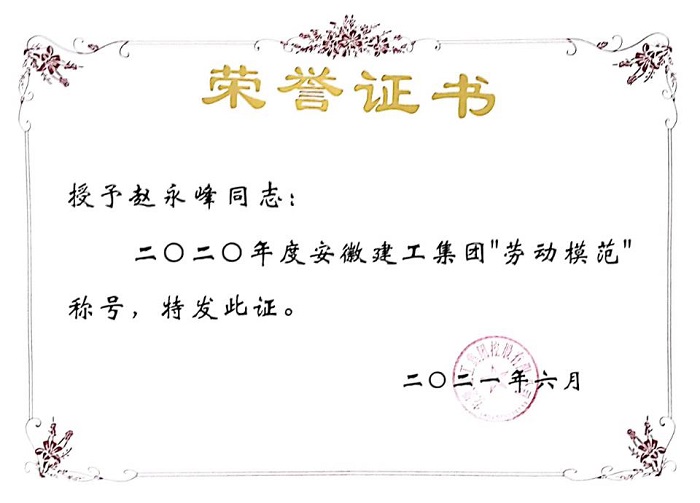 2019年3月,根據(jù)安徽安裝公司拓展市場、加快發(fā)展的工作要求,趙永峰勇挑重?fù)?dān),擔(dān)負(fù)起了合肥分公司“開拓市場一片天”的重任,團結(jié)帶領(lǐng)分公司班子成員和全體員工立足新起點、整裝再出發(fā),努力為實現(xiàn)分公司新一輪大發(fā)展而不懈奮斗,取得的可喜成績得到了領(lǐng)導(dǎo)和員工們的一致認(rèn)可和稱贊。受到安徽建工集團及安徽省工業(yè)設(shè)備安裝有限公司的表彰,在2021年7月1日-2日召開的安徽建工集團控股有限公司二屆一次職工代表大會暨“七一”表彰會上,趙永峰同志作為集團勞動模范代表光榮的上臺授獎。