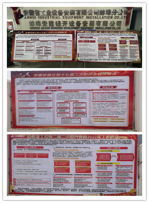 2月10日—11日,在分公司機關和各在建項目一線召開兩級職代會精神專題宣貫會。會議由分公司黨支部書記程茂麗主持。會上,程茂麗首先傳達了集團公司黨委書記、董事長趙時運在集團二屆二次職代會暨2022年度工作會議作的題為《奮力譜寫安徽建工高質(zhì)量發(fā)展新篇章 以優(yōu)異成績迎接黨的二十大勝利召開》的講話和集團黨委副書記、總經(jīng)理、董事劉家靜作的題為《拉高標桿、爭創(chuàng)一流 不斷實現(xiàn)安徽建工更高質(zhì)量更可持續(xù)發(fā)展》的工作報告;隨后又帶領大家深入解讀了公司黨委書記、董事長胡六中在公司十七屆二次職代會上所作的《守正創(chuàng)新 實干篤行 強基固本 競進提質(zhì) 以趕考姿態(tài)答好安徽安裝高質(zhì)量發(fā)展新答卷》的報告及《黨建領航聚合力 深度融合強保障 以高質(zhì)量黨建領航安徽安裝高質(zhì)量發(fā)展》的講話。