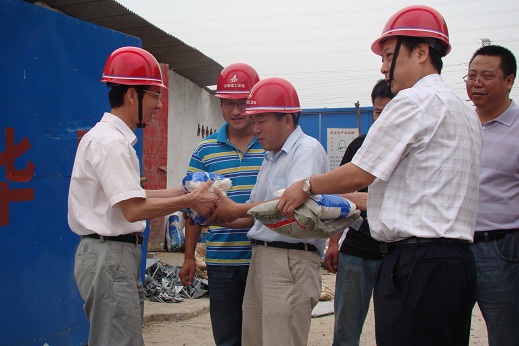 7月27日上午,集團(tuán)公司黨委書記張海平,工會副主席李鵬飛等集團(tuán)工會干部一行,在公司戴書記及工會、生產(chǎn)管理處同志陪同下,來到安裝公司“安徽中煙工業(yè)公司新辦公區(qū)附屬樓安裝工程”項目部,看望并慰問了正在高溫下施工的一線職工,將綠豆、礦泉水等物品分發(fā)到職工手中,為職工送去了夏日的清涼問候和組織的關(guān)愛。