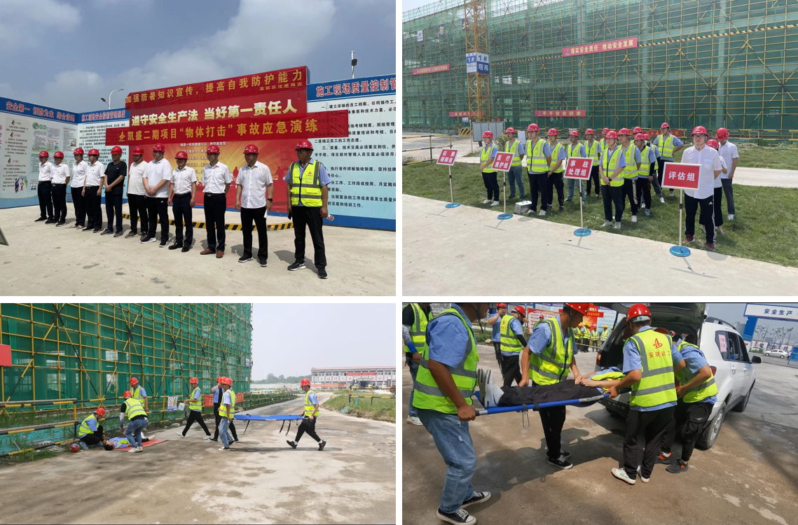 為了落實公司、分公司安全生產(chǎn)月的各項活動部署,進(jìn)一步提升施工現(xiàn)場人員的安全防范意識及應(yīng)急救援處置能力,6月20日上午10點,蚌埠分公司、房建(裝飾)分公司在凱盛科技超薄柔性玻璃二期項目施工現(xiàn)場聯(lián)合開展了“物體打擊”事故應(yīng)急救援演練活動,公司安全管理部副經(jīng)理蔣秀正、蚌埠分公司領(lǐng)導(dǎo)班子成員、房建(裝飾)分公司領(lǐng)導(dǎo)班子成員、監(jiān)理單位代表、項目人員共30余人參加演練。