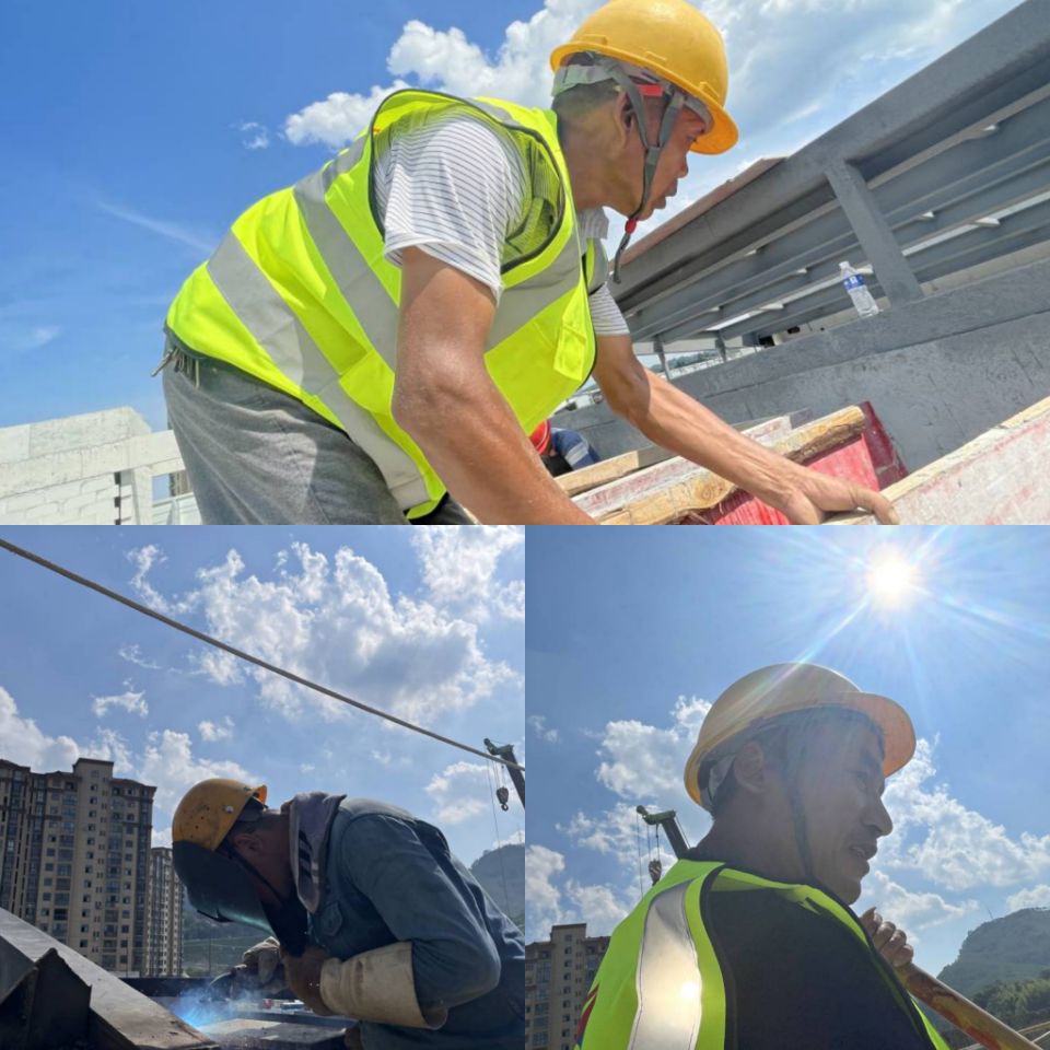 合肥分公司岳西恒泰城項(xiàng)目一線工人頂著38度高溫,揮汗如雨默默奉獻(xiàn);圖為模板安裝、焊接作業(yè)及混凝土澆筑施工。