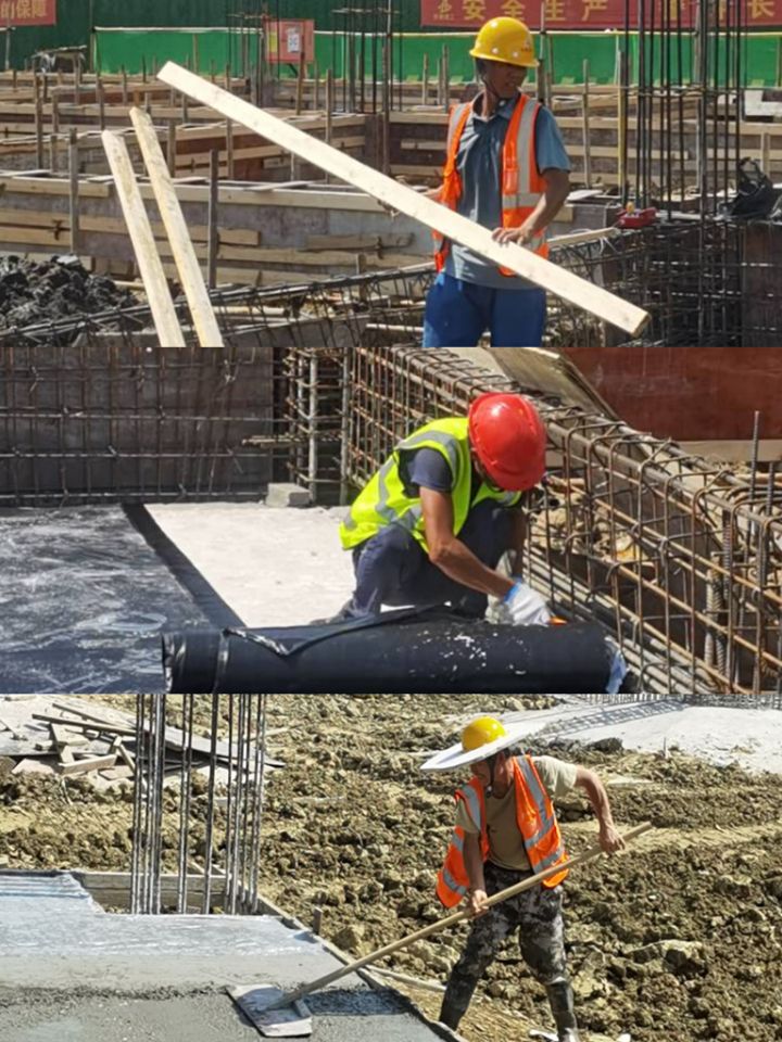合肥分公司肥西安信立士項(xiàng)目一線工人在熱浪滾滾中堅(jiān)守崗位;圖為木工支模、貼防水卷材及地坪抹平施工。