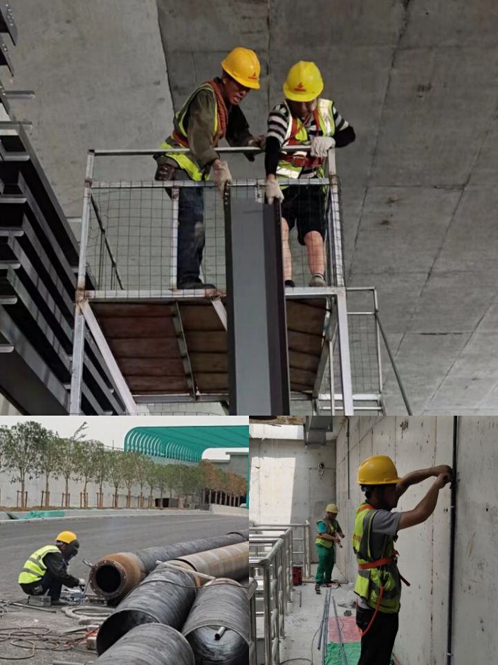 合肥分公司花園大道項(xiàng)目一線工人不遺余力苦干實(shí)干,汗水和膚色就是最好的見證;圖為隧道內(nèi)橋架安裝、管道預(yù)制焊接及雨水泵房電氣配管施工。