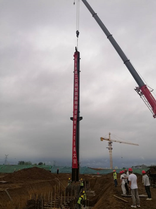 2022年7月26日上午8:18分,在項目建設單位、監(jiān)理單位、總包單位等領導的共同見證下,安徽建工交通智造基地項目鋼結構工程迎來了隆重的鋼結構首吊儀式。只見首根長約21.2米、重約11.6噸的鋼柱緩緩升起、穩(wěn)穩(wěn)落地,精準定位在安裝位置上,這標志著該項目正式進入鋼結構主體安裝階段。