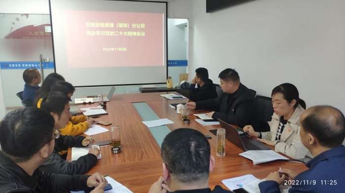 11月9日上午,房建(裝飾)分公司黨支部組織全體黨員、機(jī)關(guān)干部職工、在肥項(xiàng)目經(jīng)理召開學(xué)習(xí)宣貫黨的二十大精神專題會議。會議由支部書記程茂麗主持。