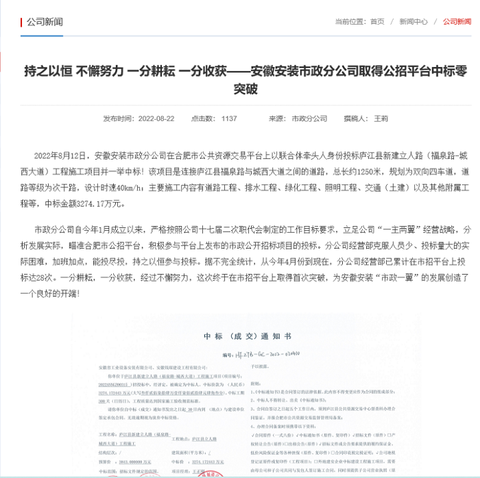 開(kāi)拓市場(chǎng)取得突破。今年以來(lái),分公司積極采取參與集團(tuán)內(nèi)部產(chǎn)業(yè)鏈專業(yè)分包競(jìng)標(biāo)和外部公招項(xiàng)目投標(biāo)雙向并舉的方式拓展市場(chǎng),打開(kāi)經(jīng)營(yíng)局面,連續(xù)承接了蜀山區(qū)體育公園項(xiàng)目安裝工程等多個(gè)項(xiàng)目。同時(shí)積極參與合肥市公招平臺(tái)投標(biāo),8月份一舉中標(biāo)廬江縣新建立人路(福泉路-城西大道)工程施工項(xiàng)目,中標(biāo)金額3274.17萬(wàn)元,取得公招投標(biāo)零的突破。