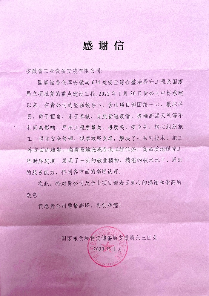 近日,安徽安裝合肥分公司收到業(yè)主方國(guó)家糧食和物資儲(chǔ)備局安徽局六三四處的感謝信,對(duì)公司“國(guó)家儲(chǔ)備倉(cāng)庫(kù)安徽局634處安全綜合整治提升工程”克服諸多困難,精心組織,科學(xué)管理,高質(zhì)量完成工程施工任務(wù)的突出成績(jī)給予高度贊揚(yáng),并表達(dá)了由衷感謝。