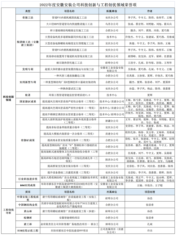 附:2022年度安徽安裝公司科技創(chuàng)新與工程創(chuàng)優(yōu)領(lǐng)域榮譽(yù)項(xiàng)