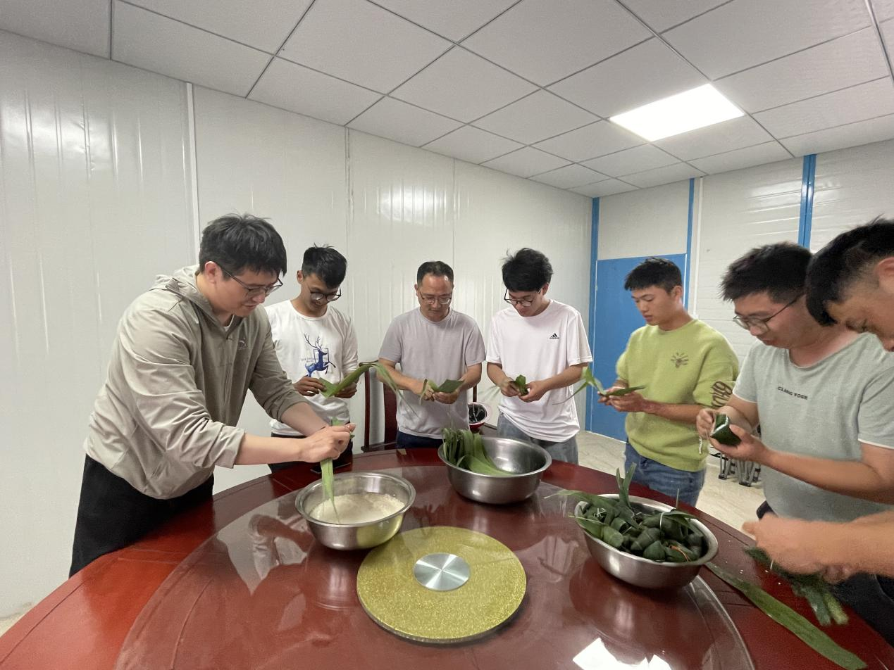 富有經(jīng)驗的彭韋銘耐心細(xì)致地為大家講解了疊粽葉、填料、捆扎等包粽子的詳細(xì)流程。大家在一片歡聲笑語中開始了包粽子活動,將粽葉做成漏斗狀,填上糯米,壓實封口,最后捆扎。盡管大部分人都是第一次包粽子,但是大家熱情高漲,每個人包的粽子都有自己的特色。香噴噴的粽子,歡快的活動,緊張的生產(chǎn),使單調(diào)的工地生活增添了色彩。