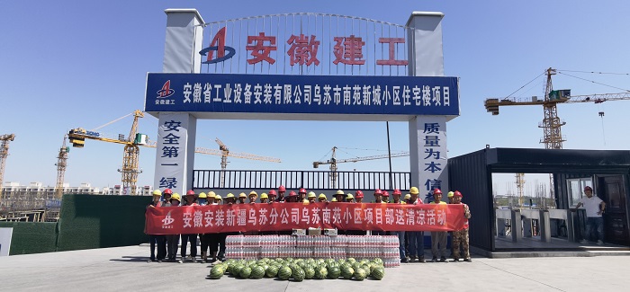6月的新疆,烈日當(dāng)頭、酷暑難耐,新疆烏蘇市氣溫一度沖破38℃,給一線施工人員帶來嚴(yán)峻的“烤”驗。為了確保烏蘇市南苑新城小區(qū)住宅樓建設(shè)項目施工進(jìn)度不滯后,項目部管理人員及一線工人斗烈日、戰(zhàn)酷暑,加班加點、揮汗如雨、搶抓進(jìn)度。近日,新疆烏蘇分公司南苑新城項目部組織“送清涼”活動,為一線工人送去礦泉水、西瓜、綠豆、冰糖、藿香正氣水、十滴水等防暑降溫物品,并叮囑他們高溫季節(jié)施工,一定保護(hù)好自己身體。