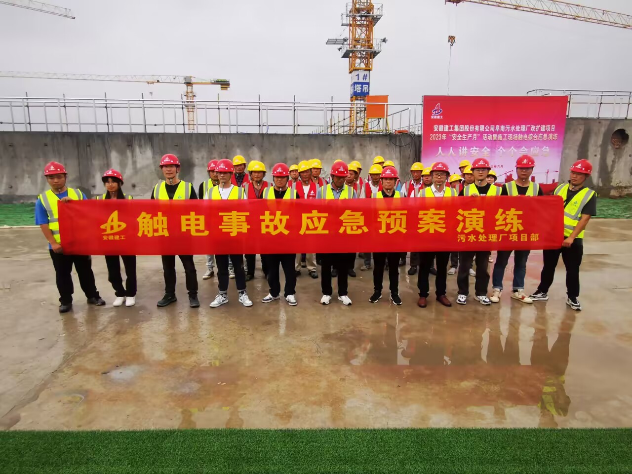 為提高員工應(yīng)對突發(fā)事故的應(yīng)急能力,檢驗應(yīng)急預(yù)案的可行性,切實落實“安全第一、預(yù)防為主、綜合治理”的安全生產(chǎn)方針。6月18日上午,房建(裝飾)分公司聯(lián)合電梯分公司在阜南污水處理廠項目部組織開展觸電事故應(yīng)急演練。房建分公司和電梯分公司領(lǐng)導(dǎo)班子成員及分公司職能部門、項目全體成員參加本次演練活動。
