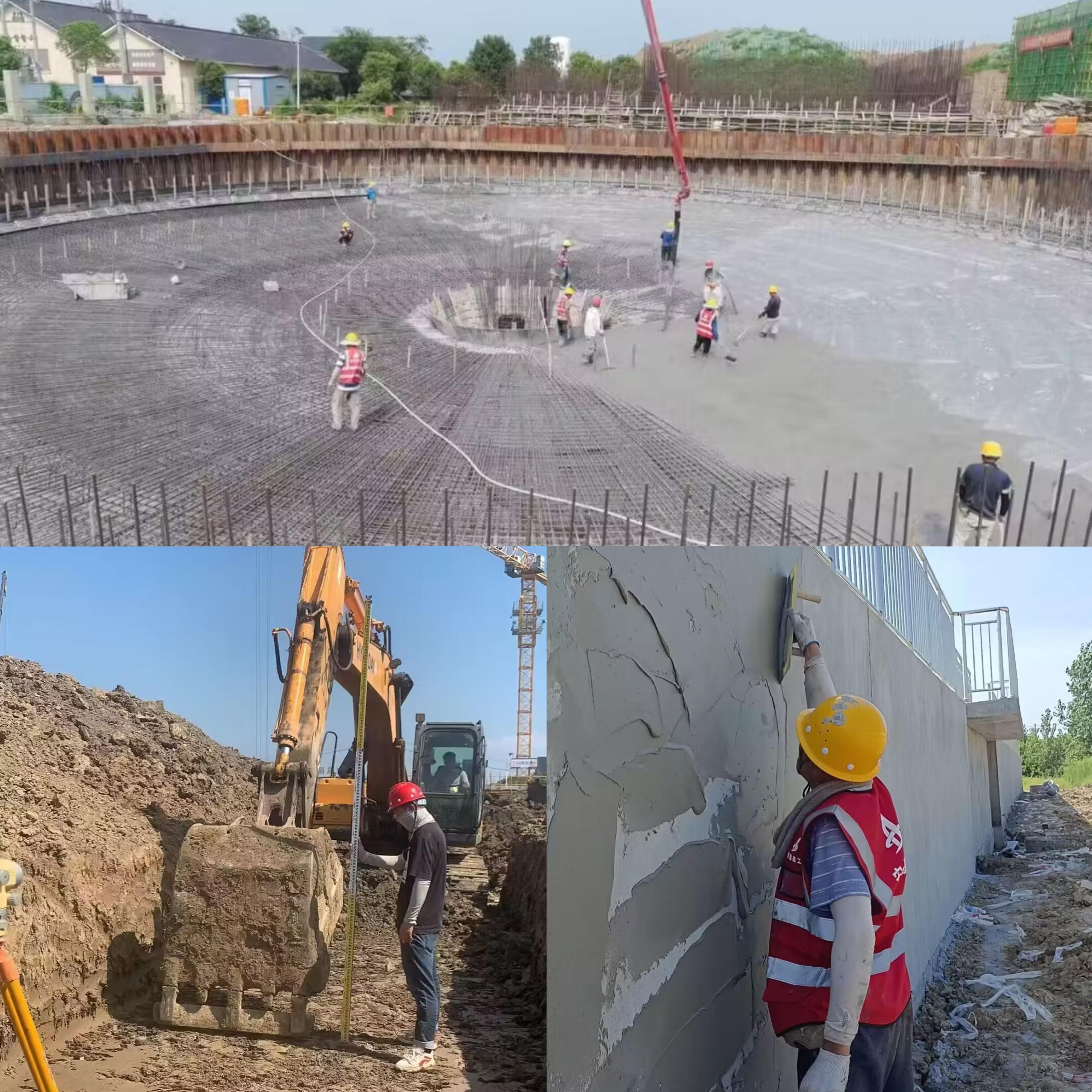 圖為:阜南城南污水處理廠(chǎng)改擴(kuò)建及配套管網(wǎng)工程二沉池筏板混凝土澆筑、配電房基礎(chǔ)開(kāi)挖及均質(zhì)池外墻粉刷施工