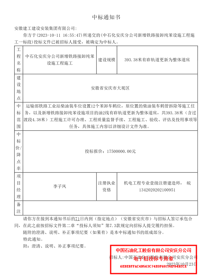 近日,建工安裝安慶分公司成功中標中石化安慶分公司新增鐵路接卸純苯設(shè)施工程,中標金額為1750萬元。