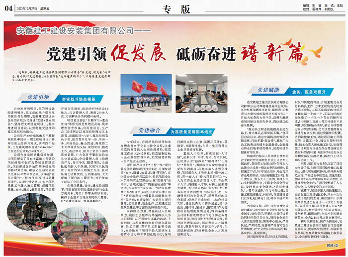 近年來,安徽建工建設安裝集團有限公司秉承抓黨建促發(fā)展的理念,著力做好黨建領航,結合實際把支部建在項目上,以高質量黨建引領公司高質量發(fā)展。