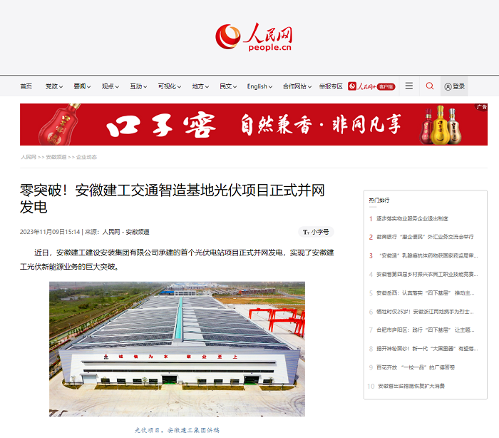 【名媒聚焦】人民網(wǎng):零突破!安徽建工交通智造基地光伏項(xiàng)目正式并網(wǎng)發(fā)電