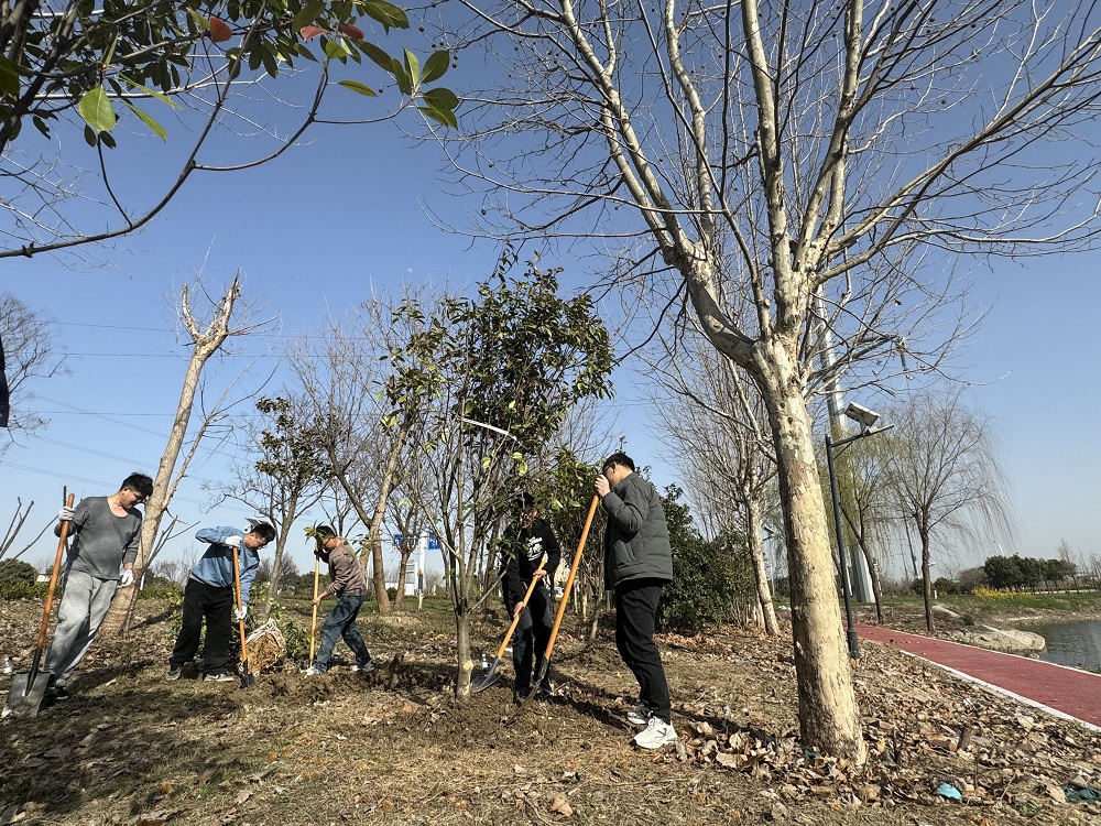 植樹現(xiàn)場,團員青年們熱情高漲、干勁十足。大家通力協(xié)作、揮鍬鏟土、踏土夯苗、提水澆灌,忙的不亦樂乎。經過一番辛勤勞動,多株翠綠的樹苗迎風而立,一片勃勃生機的景象,為河岸再添新綠。