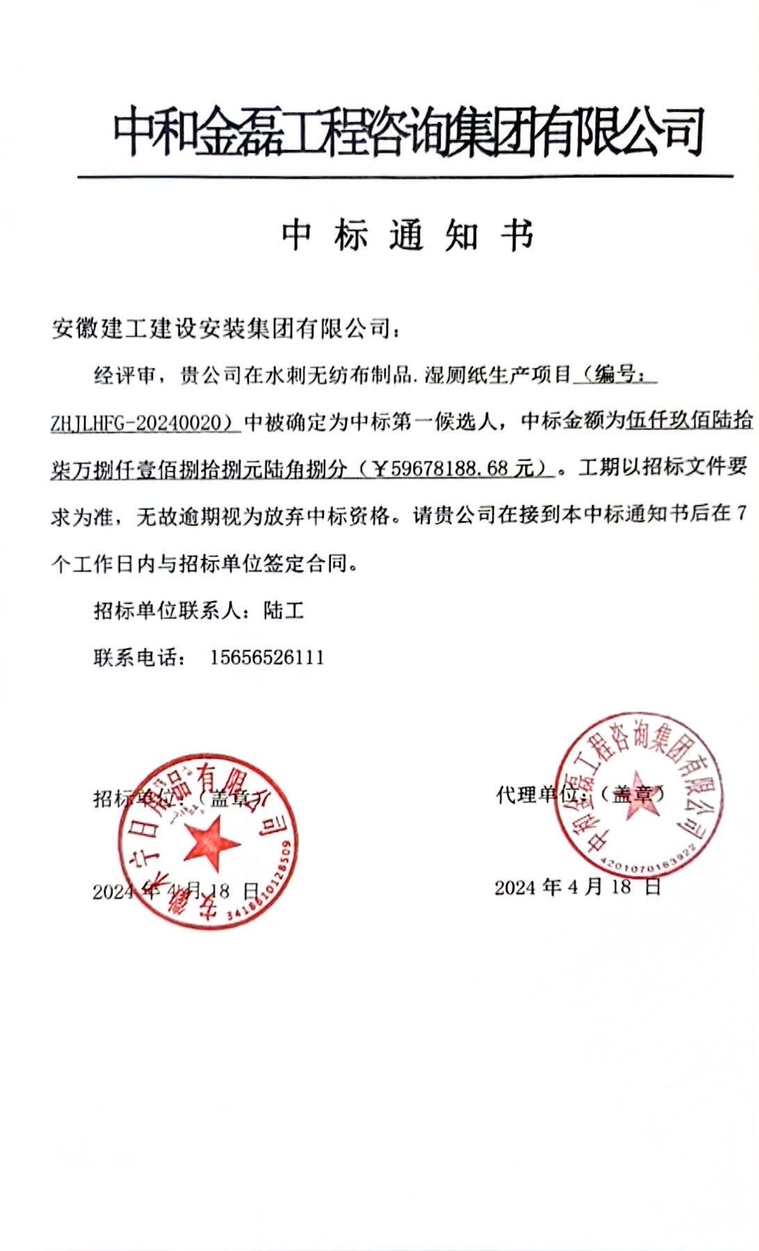 再傳喜訊!建工安裝蚌埠分公司中標(biāo)安徽禾寧日用品有限公司水刺無(wú)紡布制品廠房建設(shè)項(xiàng)目,合計(jì)中標(biāo)金額5968萬(wàn)元。