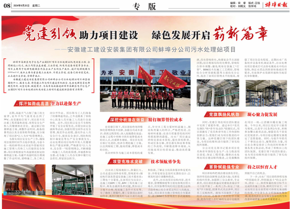 媒體專版報(bào)道了建工安裝蚌埠分公司高新區(qū)電子信息產(chǎn)業(yè)園EPC項(xiàng)目污水處理站機(jī)電安裝工程項(xiàng)目的基本概況,以及該項(xiàng)目抓黨建、保生產(chǎn)、降成本、強(qiáng)技術(shù)、育人才等方面的成功經(jīng)驗(yàn)和做法。