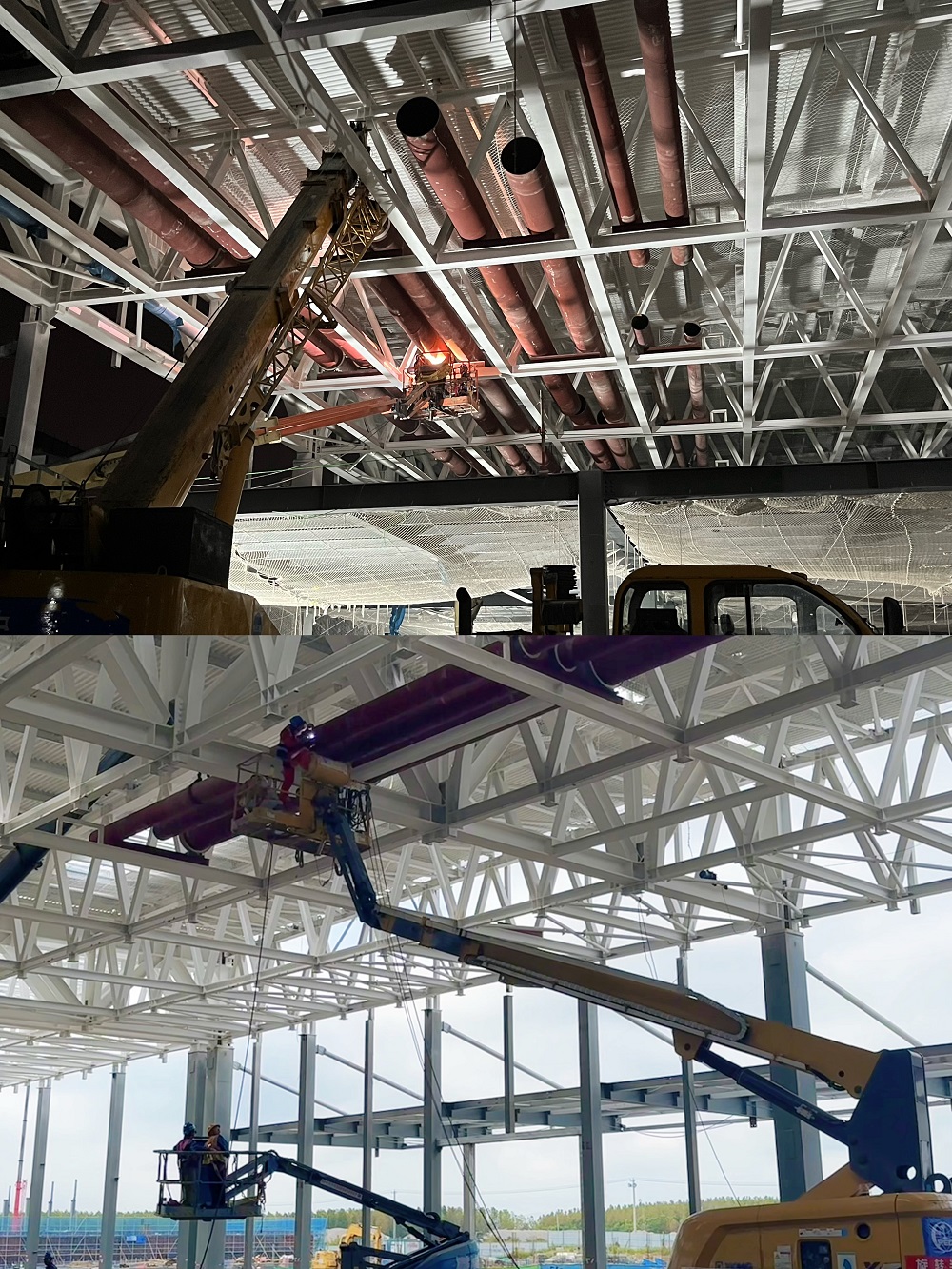 該項目本階段正在進(jìn)行各車間直徑DN700、DN800的空調(diào)冷凍水管道吊裝搶工。為了能早日完成空調(diào)冷凍水管道吊裝的工程節(jié)點目標(biāo),項目管理人員以工期進(jìn)度為主線,多次召開技術(shù)商討會,合理優(yōu)化吊裝施工方案,全體員工實行24小時輪班工作制,夜晚輪流值班,晝夜奮戰(zhàn)、奮勇爭先,發(fā)起項目加速建設(shè)的“最強攻勢”。