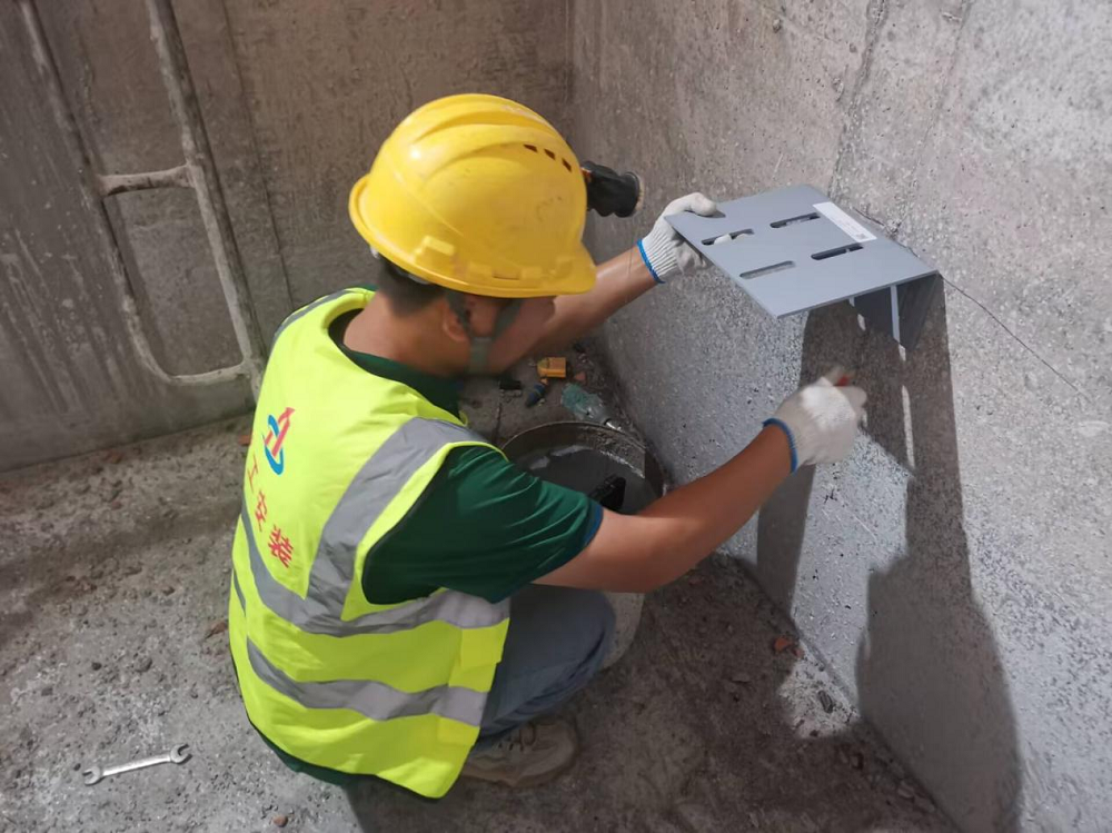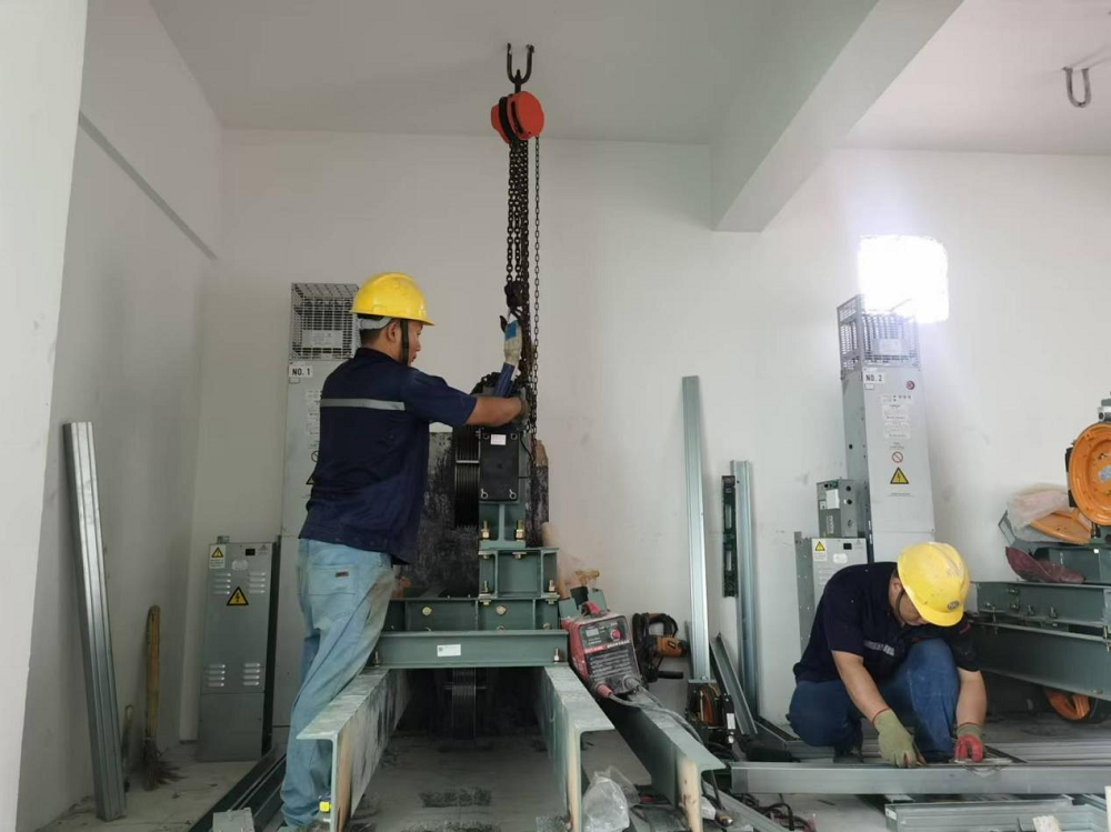 蚌埠經(jīng)開區(qū)消防二中隊(duì)項(xiàng)目現(xiàn)場(chǎng)施工人員正在安裝電梯支架