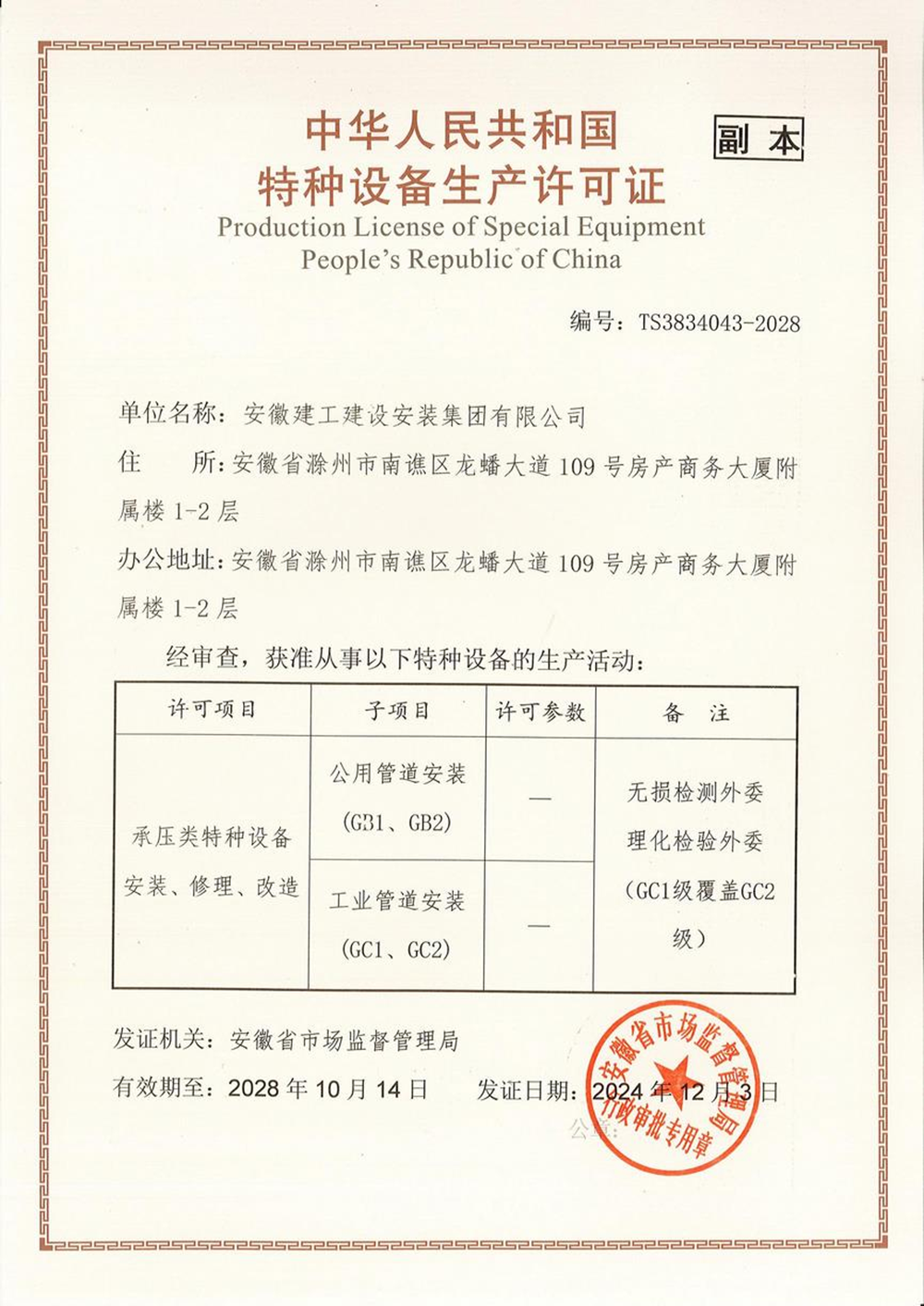 近日,建工安裝“承壓類(lèi)特種設(shè)備安裝、修理、改造—壓力管道(GB1、GB2)、(GC1、GC2)”延續(xù)換證工作順利通過(guò)中國(guó)工業(yè)氣體工業(yè)協(xié)會(huì)、安徽省特種設(shè)備檢測(cè)院等各方的評(píng)審核查,現(xiàn)已取得安徽省市場(chǎng)監(jiān)督管理局頒發(fā)的新證,為公司相關(guān)業(yè)務(wù)的開(kāi)展奠定了良好基礎(chǔ)。