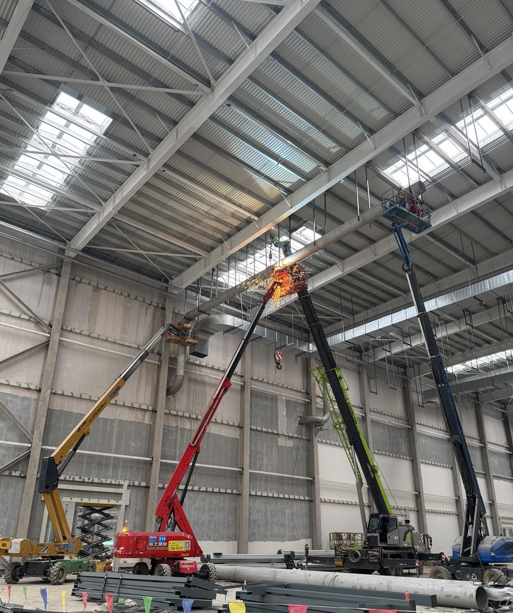 為確保施工有序高效運(yùn)行,項(xiàng)目部嚴(yán)格按照總體工期計(jì)劃部署施工任務(wù),加大人力、材料、機(jī)械投入,組織多個(gè)工作面同時(shí)展開施工,確保工程各節(jié)點(diǎn)進(jìn)度有效推進(jìn)。截至目前,沖壓車間架空循環(huán)水主管道已安裝完成進(jìn)入介質(zhì)間。車間一閣樓空調(diào)水主管安裝完成3600米,管道風(fēng)機(jī)安裝65臺,組空安裝4臺,閣樓配電房移交3個(gè),配電柜安裝90臺,橋架安裝1500米,電線電纜安裝10000余米,各種燈具安裝200盞,消防報(bào)警設(shè)備安裝160套。