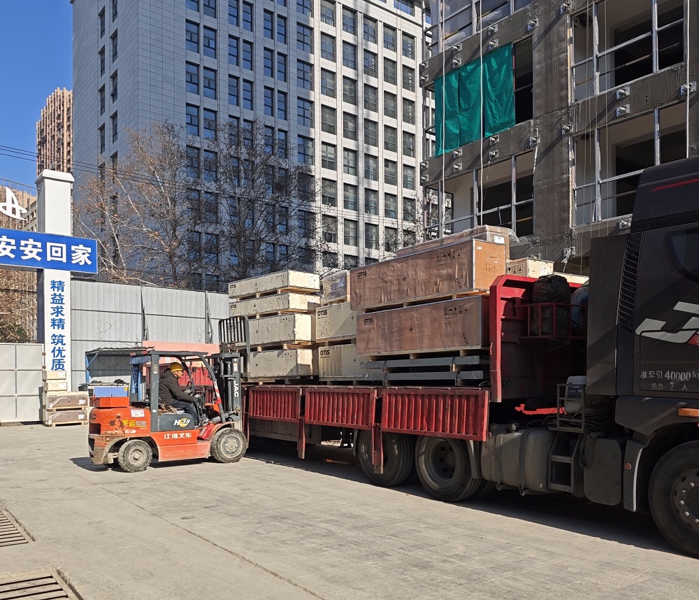 分公司商機(jī)廠租賃住房項(xiàng)目電梯到貨,現(xiàn)場施工人員正在準(zhǔn)備卸貨