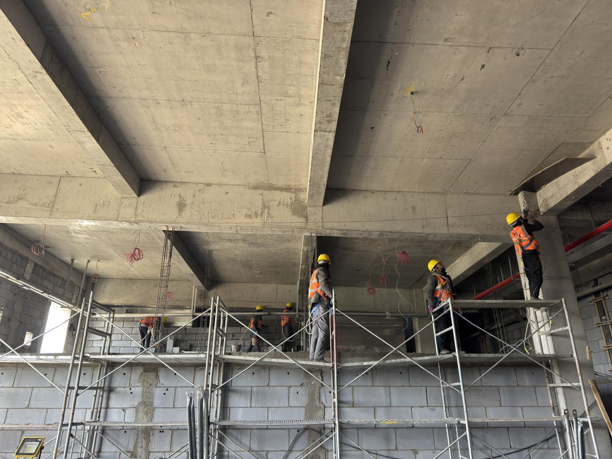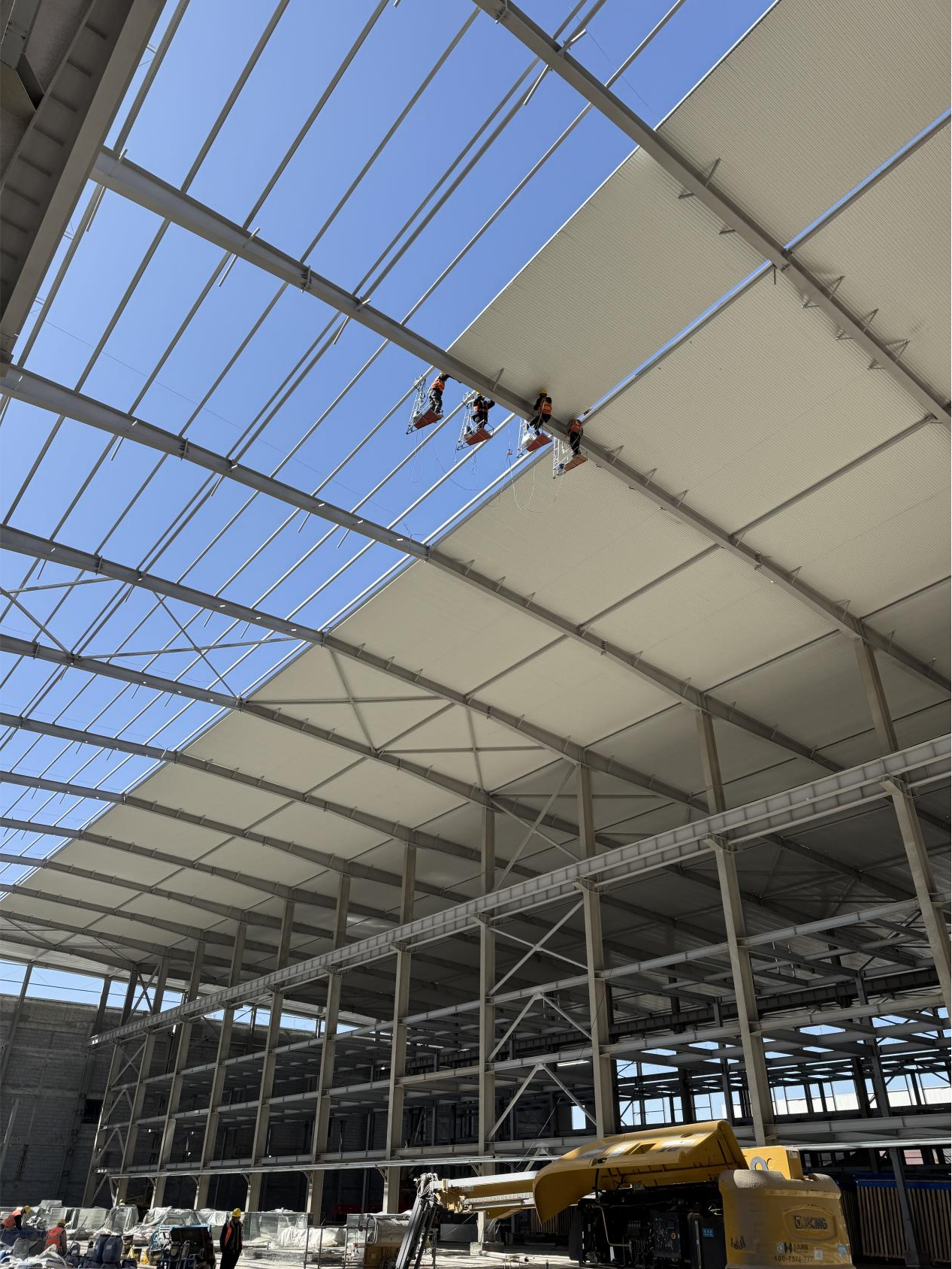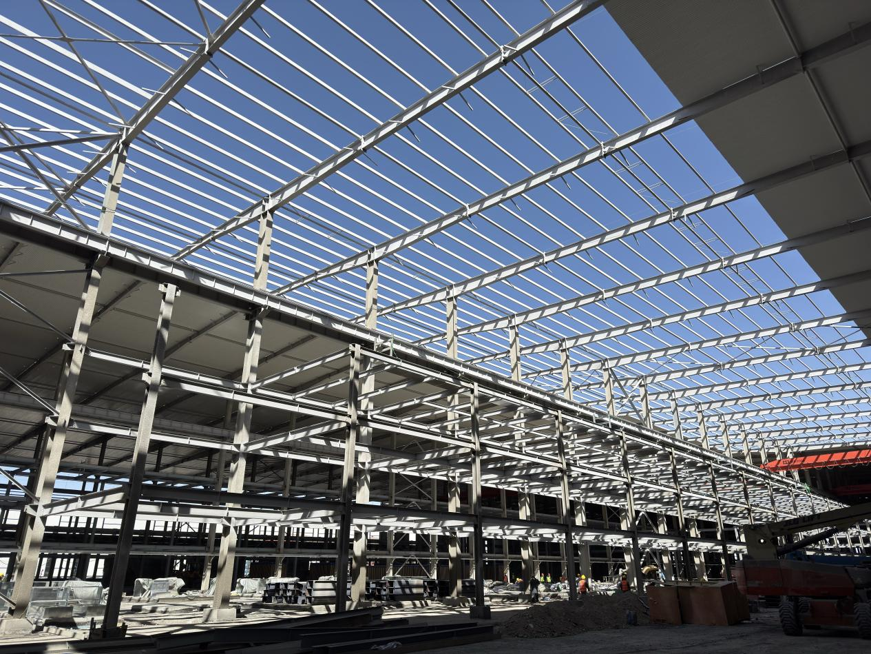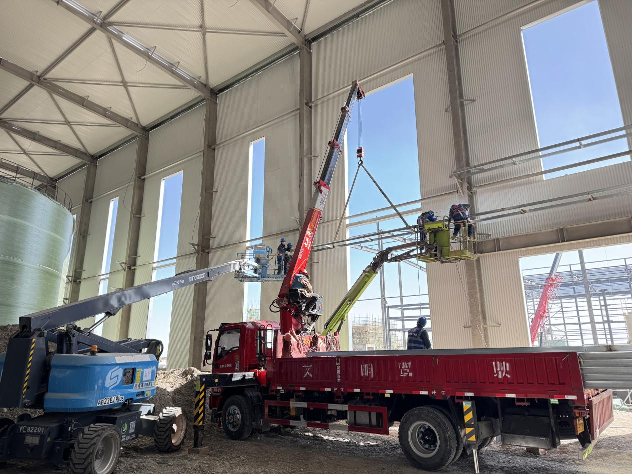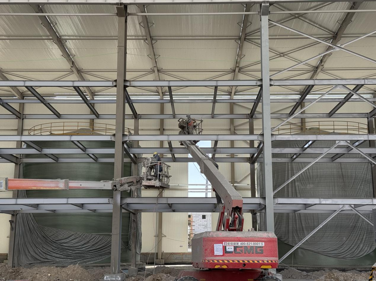 項(xiàng)目地處高海拔鹽湖區(qū),缺氧且淡水匱乏,施工環(huán)境惡劣,資源保障困難。面對(duì)不利因素,項(xiàng)目團(tuán)隊(duì)迎難而上,積極尋找解決方案,為項(xiàng)目順利推進(jìn)筑牢基礎(chǔ)。截至目前,項(xiàng)目已取得顯著階段性成果,廠房主鋼構(gòu)全部完成,管廊鋼結(jié)構(gòu)完成約95%,防火涂料完成80%,屋面及墻面圍護(hù)結(jié)構(gòu)完成約50%,配電房裝飾裝修工作有序進(jìn)行,各項(xiàng)任務(wù)按計(jì)劃穩(wěn)步推進(jìn)。