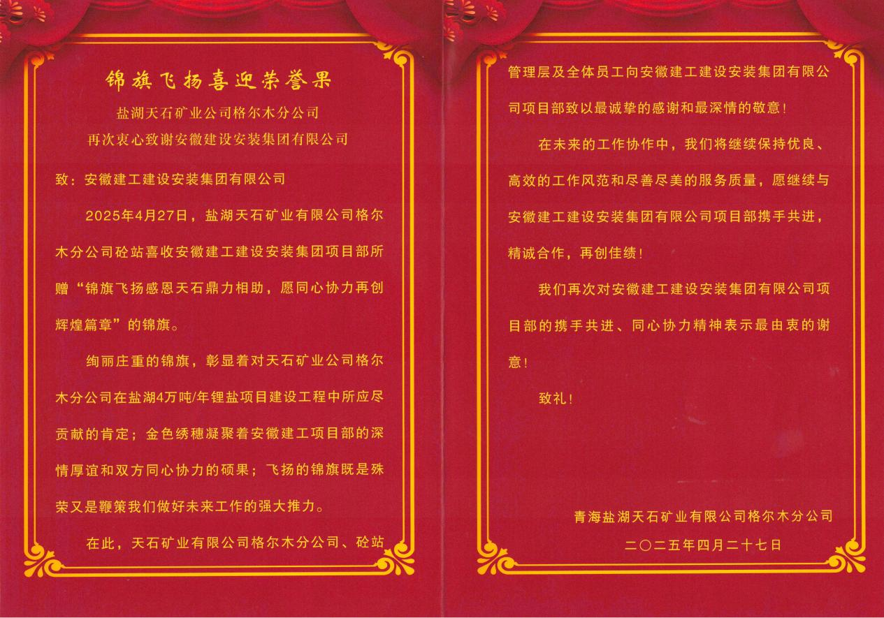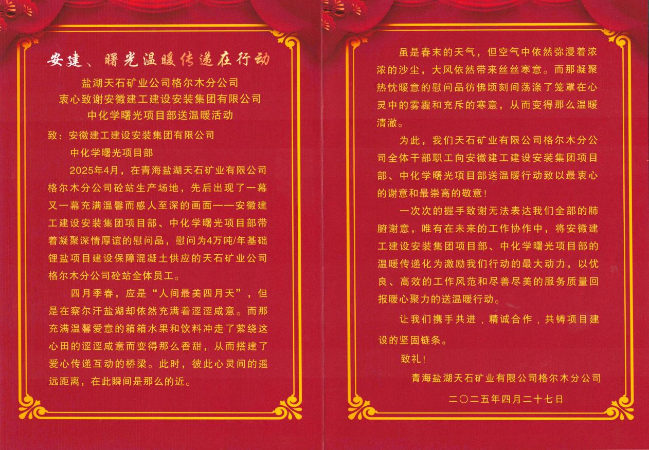 信中,青海鹽湖天石礦業(yè)有限公司格爾木分公司對(duì)建工安裝項(xiàng)目部此前慰問(wèn)砼站全體員工致以最誠(chéng)摯的感謝,愿繼續(xù)與建工安裝項(xiàng)目部攜手共進(jìn)、精誠(chéng)合作、再創(chuàng)佳績(jī)!這封感謝信不僅是對(duì)項(xiàng)目部過(guò)往成績(jī)的肯定,更是一份振奮人心的激勵(lì)。建工安裝將繼續(xù)保持高昂斗志和嚴(yán)謹(jǐn)態(tài)度,加強(qiáng)與相關(guān)單位溝通協(xié)作,強(qiáng)化項(xiàng)目管理,確保項(xiàng)目按期、高質(zhì)量交付,為打造世界級(jí)鹽湖提鋰產(chǎn)業(yè)基地貢獻(xiàn)力量!