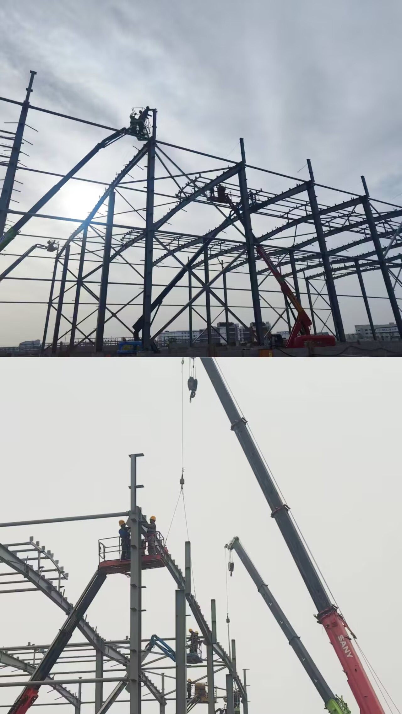走進(jìn)項(xiàng)目施工現(xiàn)場,起重機(jī)揮動著粗壯的鋼鐵臂膀劃破天際,將一段段鋼梁精準(zhǔn)的吊裝至安裝位,曲臂車托舉著工人將鋼構(gòu)件嵌入到預(yù)定位置,保障高空作業(yè)人員的生命安全。這是力量與技術(shù)的二重奏,更是安全與效率的完美平衡,一幅現(xiàn)代工業(yè)建筑的壯美畫卷正徐徐展開。