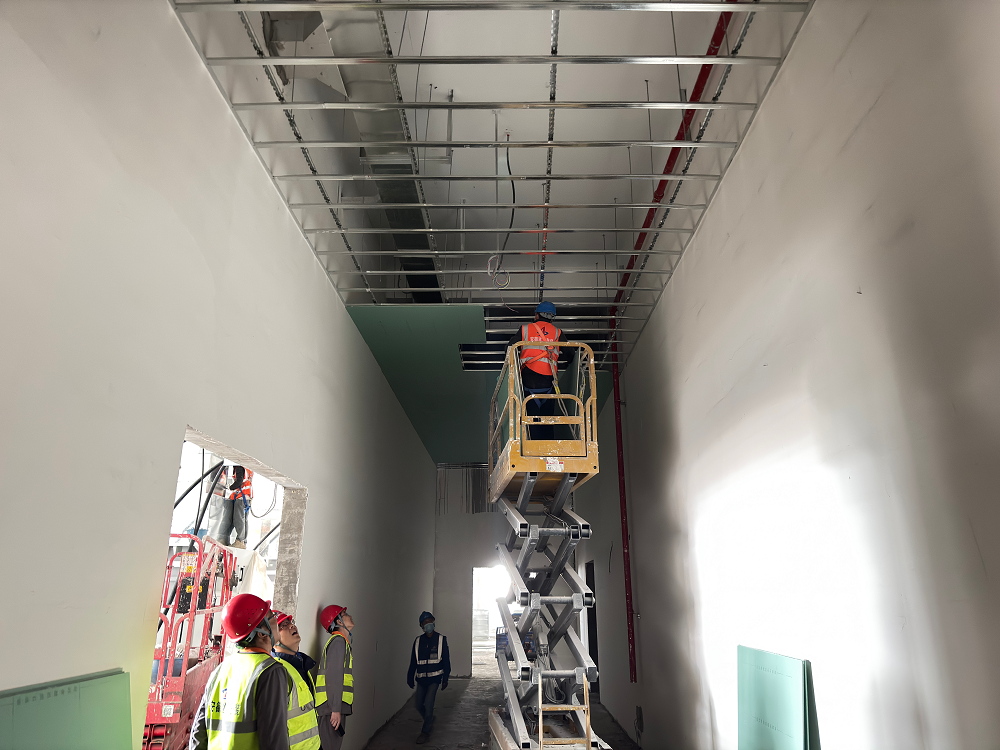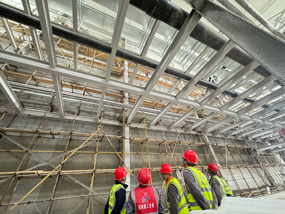 青海高原,氣候惡劣,環(huán)境艱苦,高寒缺氧,但這些困難并沒(méi)有阻擋項(xiàng)目部全體成員奮斗的步伐。施工現(xiàn)場(chǎng),機(jī)器轟鳴聲此起彼伏,工人們頭戴安全帽,身系安全繩,操作著各種設(shè)備,熟練地進(jìn)行著防水卷材敷設(shè)、吊頂板安裝、鋼筋綁扎、外墻抹灰、風(fēng)管安裝等作業(yè),每個(gè)環(huán)節(jié)都緊張有序,環(huán)環(huán)相扣。項(xiàng)目管理人員穿梭在各個(gè)施工點(diǎn),緊盯現(xiàn)場(chǎng)安全與質(zhì)量,及時(shí)協(xié)調(diào)解決施工中遇到的問(wèn)題,他們?nèi)硇牡赝度氲焦ぷ髦校脤I(yè)的素養(yǎng)和嚴(yán)謹(jǐn)?shù)膽B(tài)度為項(xiàng)目建設(shè)保駕護(hù)航。